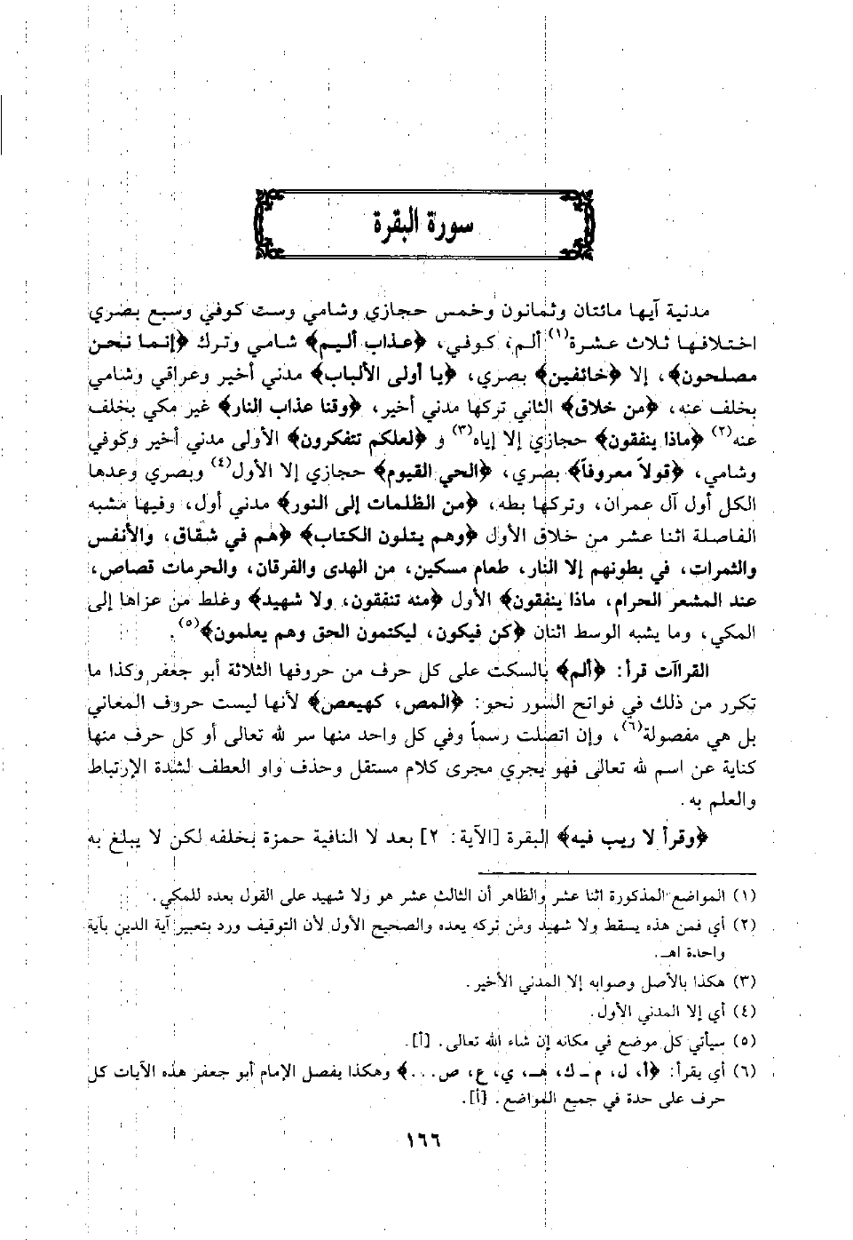 القراءات قرأ "ألم" بالسكت على كل حرف من حروفها الثلاثة أبو جعفر, وكذا ما تكرر من ذلك في فواتح السور نحو: "المص، كهيعص" لأنها ليست حروف المعاني بل هي مفصولة6 وإن اتصلت رسما, وفي كل واحد منها سر لله تعالى, أو كل حرف منها كناية عن اسم لله تعالى, فهو يجري مجرى كلام مستقل وحذف واو العطف لشدة الارتباط والعلم به وقرأ: "لا ريب فيه" [البقرة الآية: 2] بعد لا النافية حمزة بخلفه لكن لا يبلغ به