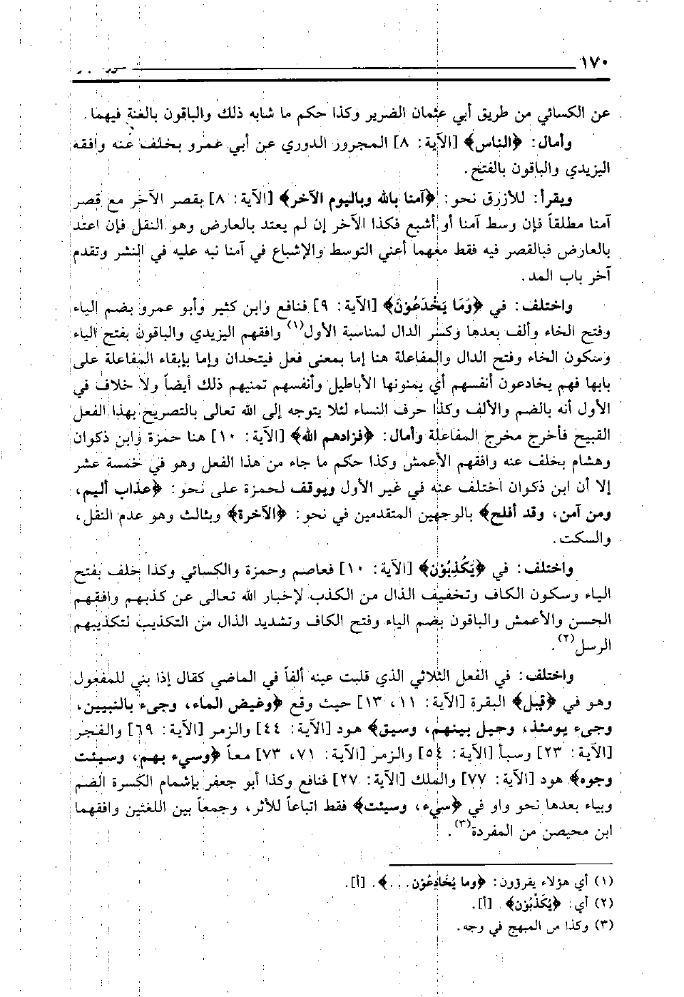 واختلف: في "وَمَا يَخْدَعُونَ" [الآية: 9] فنافع وابن كثير وأبو عمرو بضم الياء وفتح الخاء وألف بعدها وكسر الدال لمناسبة الأول1, وافقهم اليزيدي والباقون بفتح الياء وسكون الخاء وفتح الدال, والمفاعلة هنا إما بمعنى فعل فيتحدان, وإما بإبقاء المفاعلة على بابها فهم يخادعون أنفسهم أي: يمنونها الأباطيل وأنفسهم تمنيهم ذلك أيضا, ولا خلاف في الأول أنه بالضم والألف, وكذا حرف النساء لئلا يتوجه إلى الله تعالى بالتصريح بهذا الفعل القبيح, فأخرج مخرج المفاعلة وأمال: "فَزَادَهُمُ اللَّهُ" [الآية: 10] هنا حمزة وابن ذكوان وهشام بخلف عنه وافقهم الأعمش وكذا حكم ما جاء من هذا الفعل وهو في خمسة عشر إلا أن ابن ذكوان اختلف عنه في غير الأول, ويوقف لحمزة على نحو: "عذاب أليم، ومن آمن، وقد أفلح" بالوجهين المتقدمين في نحو: "الآخرة" وبثالث وهو عدم النقل والسكت.
