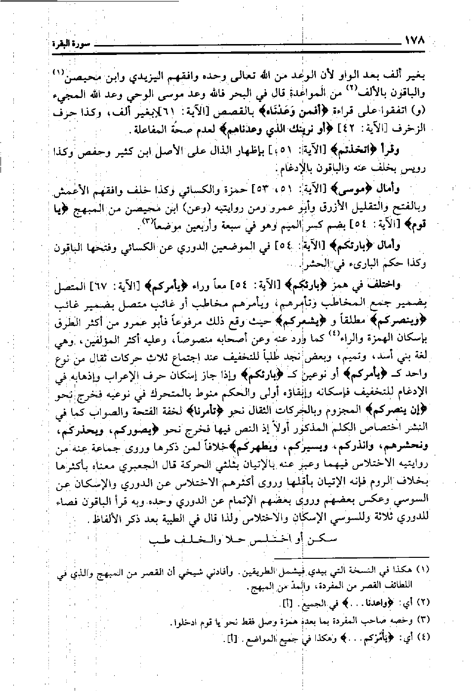 واختلف في همز "بارئكم" [الآية: 54] معا وراء "يأمركم" [الآية: 67] المتصل بضمير جمع المخاطب وتأمرهم, ويأمرهم مخاطب أو غائب متصل بضمير غائب "وينصركم" مطلقا و"يشعركم" حيث وقع ذلك مرفوعا فأبو عمرو من أكثر الطرق بإسكان الهمزة والراء4 كما ورد عنه وعن أصحابه منصوصا, وعليه أكثر المؤلفين, وهي لغة بني أسد وتميم وبعض نجد طلبا للتخفيف عند اجتماع ثلاث حركات ثقال من نوع واحد كـ"يأمركم" أو نوعين كـ"بارئكم" وإذا جاز إسكان حرف الإعراب وإذهابه في الإدغام للتخفيف فإسكانه وإبقاؤه أولى, والحكم منوط بالمتحرك في نوعيه فخرج نحو: "إن ينصركم"