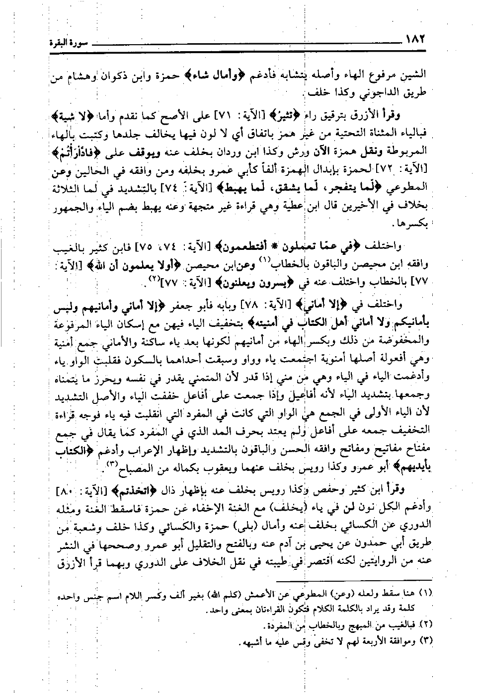 وقرأ الأزرق بترقيق راء "تثير" [الآية: 71] على الأصح كما تقدم, وأما "لا شية" فبالياء المثناة التحتية من غير همز باتفاق, أي: لا لون فيها يخالف جلدها, وكتبت بالهاء المربوطة, ونقل همزة الآن ورش وكذا ابن وردان بخلف عنه, ويوقف على "فادارأتم" [الآية: 72] لحمزة بإبدال الهمزة ألفا كأبي عمرو بخلفه ومن وافقه في الحالين, وعن المطوعي "لما يتفجر، لما يشقق، لما يهبط" [الآية: 74] بالتشديد في لما الثلاثة بخلاف في الأخيرين, قال ابن عطية: وهي قراءة غير متجهة, وعنه يهبط بضم الياء والجمهور بكسرها.