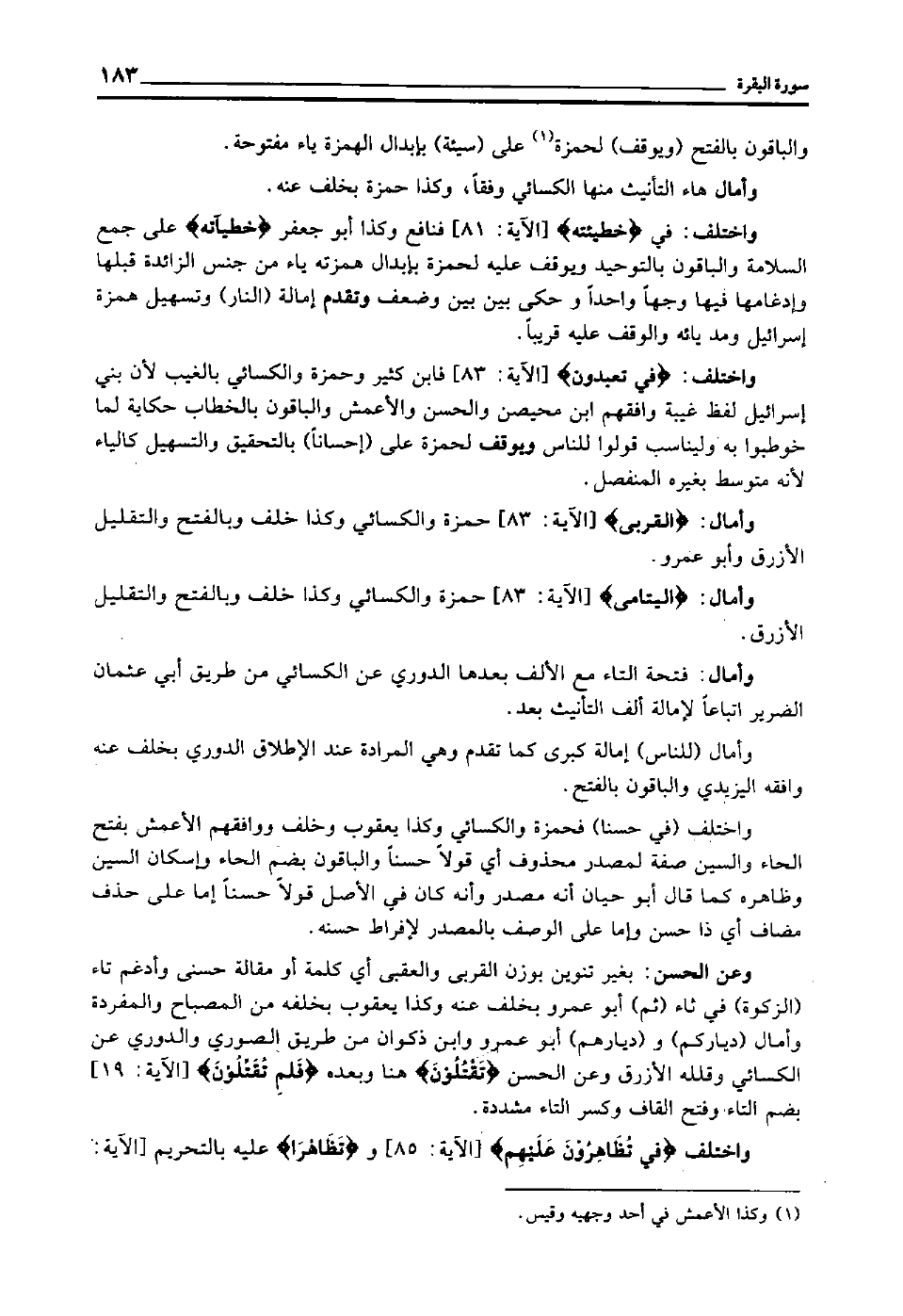 واختلف: "في تعبدون" [الآية: 83] فابن كثير وحمزة والكسائي بالغيب؛ لأني بني إسرائيل لفظ غيبة وافقهم ابن محيصن والحسن والأعمش, والباقون بالخطاب حكاية لما خوطبوا به, وليناسب قولوا للناس, ويوقف لحمزة على "إحسانا" بالتحقيق والتسهيل كالياء؛ لأنه متوسط بغيره المنفصل.