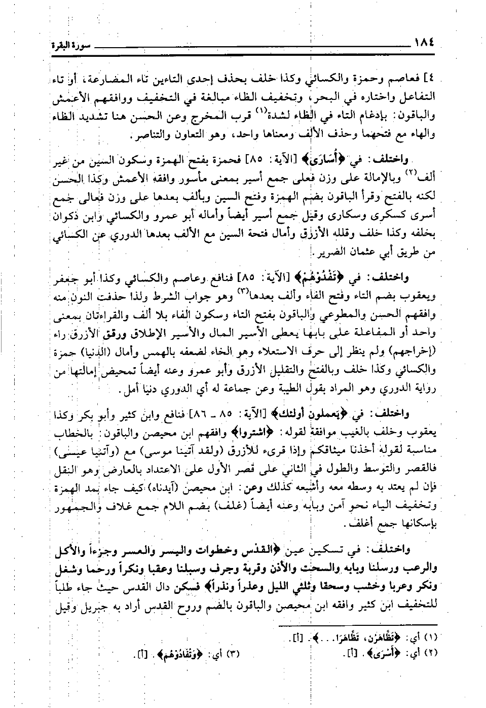 واختلف في "تفدوهم" [الآية: 85] فنافع وعاصم والكسائي وكذا أبو جعفر ويعقوب بضم التاء وفتح الفاء وألف بعدها3, وهو جواب الشرط, ولذا حذفت النون منه وافقهم الحسن والمطوعي, والباقون بفتح التاء وسكون الفاء بلا ألف, والقراءتان بمعنى واحد أو المفاعلة على بابها يعطي الأسير المال والأسير الإطلاق, ورقق الأزرق راء "إخراجهم" ولم ينظر إلى حرف الاستعلاء وهو الخاء لضعفه بالهمس, وأمال "الدنيا" حمزة والكسائي وكذا خلف, وبالفتح والتقليل الأزرق وأبو عمرو, وعنه أيضا تمحيض إمالتها من رواية الدوري وهو المراد بقول الطيبة, وعن جماعة له أي: الدوري دنيا أمل.
