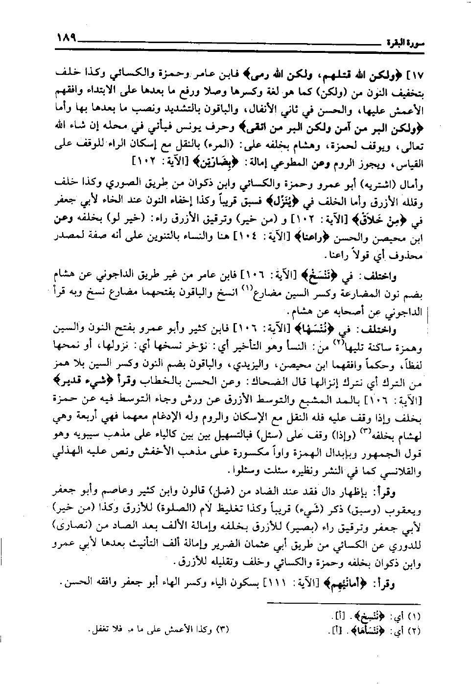 واختلف في "ننسها" [الآية: 106] فابن كثير وأبو عمرو بفتح النون والسين وهمزة ساكنة تليها2 من: النسأ وهو التأخير أي: نؤخر نسخها أي: نزولها أو نمحها لفظا وحكما, وافقهما ابن محيصن واليزيدي والباقون بضم النون وكسر السين بلا همز من الترك أي: نترك إنزالها, قال الضحاك: وعن الحسن بالخطاب وقرأ "شَيْءٍ قَدِير" [الآية: 106] بالمد المشبع والتوسط الأزرق عن ورش وجاء التوسط فيه عن حمزة بخلف, وإذا وقف عليه فله النقل مع الإسكان والروم وله الإدغام معهما فهي أربعة, وهي لهشام بخلفه3 "وإذا" وقف على "سئل" فبالتسهيل بين بين كالياء على مذهب سيبويه, وهو قول الجمهور, وبإبدال الهمزة واوا مكسورة على مذهب الأخفش, ونص عليه الهذلي والقلانسي كما في النشر ونظيره سئلت وسئلوا.