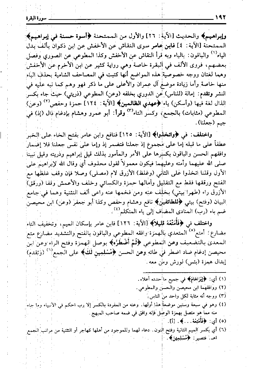 واختلف في "فَأُمَتِّعُهُ قَلِيلًا" [الآية: 126] فابن عامر بإسكان الميم, وتخفيف التاء مضارع: أمتع 5المتعدي بالهمزة وافقه المطوعي, والباقون بالفتح والتشديد مضارع متع المعدى بالتضعيف, وعن المطوعي "ثُمَّ أَضْطَرُّه" بوصل الهمزة وفتح الراء وعن ابن محيصن إدغام ضاد اضطر في طائه وعن الحسن "مُسْلِمَيْنِ لَك" على الجمع6 وتقدم إبدال همزة بئس لورش ومن معه.