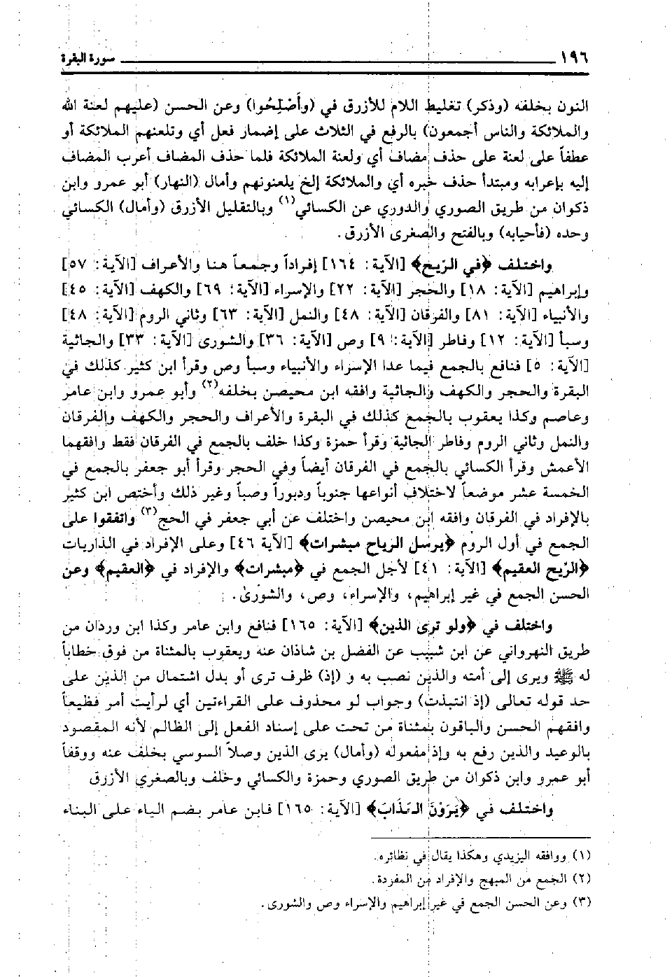 واختلف "في الريح" [الآية: 164] إفرادا وجمعا هنا و [الأعراف الآية: 57] و [إبراهيم الآية: 18] و [الحجر الآية: 22] و [الإسراء الآية: 69] و [الكهف الآية: 45] و [الأنبياء الآية: 81] و [الفرقان الآية: 48] و [النمل الآية: 63] وثاني [الروم الآية: 48] و [سبأ الآية: 12] و [فاطر الآية: 9] و [ص الآية: 36] و [الشورى الآية: 33] و [الحاثية الآية: 5] فنافع بالجمع فيما عدا الإسراء والأنبياء وسبأ وص, وقرأ ابن كثير كذلك في: البقرة والحجر والكهف والجاثية, وافقه ابن محيصن بخلفه2, وأبو عمرو وابن عامر وعاصم وكذا يعقوب بالجمع, كذلك في البقرة والأعراف والحجر والكهف والفرقان والنمل وثاني الروم وفاطر والجاثية, وقرأ حمزة وكذا خلف بالجمع في الفرقان فقط, وافقهما الأعمش, وقرأ الكسائي بالجمع في الفرقان أيضا وفي الحجر, وقرأ أبو جعفر بالجمع في الخمسة عشر موضعا لاختلاف أنواعها جنوبا ودبورا وصبا وغير ذلك, واختص ابن كثير بالإفراد في الفرقان وافقه بان محيصن واختلف عن أبي جعفر في الحج3, واتفقوا على الجمع في أول الروم "يُرْسِلَ الرِّيَاحَ مُبَشِّرَات" [الآية: 46] وعلى الإفراد في الذاريات "الرِّيحَ الْعَقِيم" [الآية: 41] لأجل الجمع في "مبشرات" والإفراد في "العقيم" وعن الحسن الجمع في غير إبراهيم والإسراء وص والشورى.