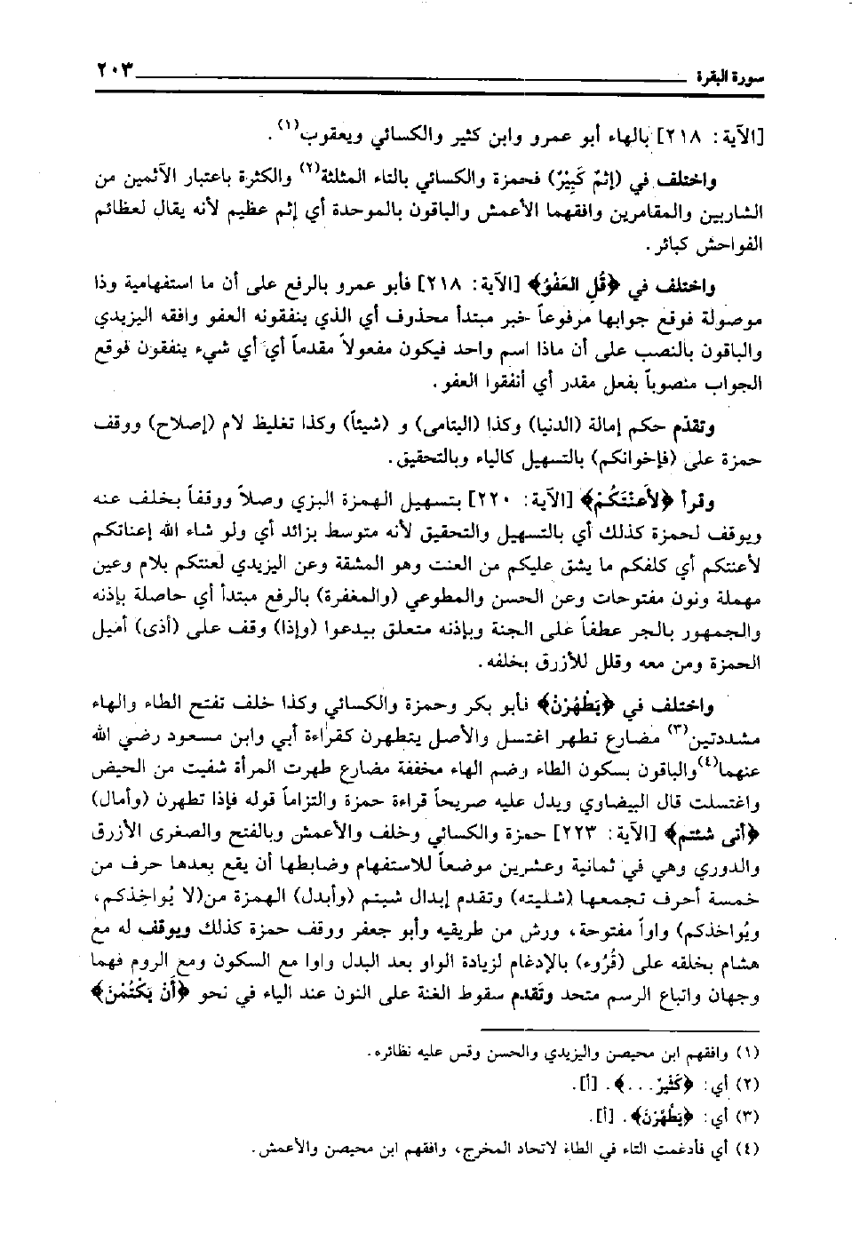واختلف في "يطهرن" فأبو بكر وحمزة والكسائي وكذا خلف تفتح الطاء والهاء مشددتين3 مضارع تطهر اغتسل, والأصل يتطهرن, كقراءة أبي وابن مسعود رضي الله عنهما4 والباقون بسكون الطاء وضم الهاء مخففة مضارع طهرت المرأة شفيت من الحيض واغتسلت, قال البيضاوي: ويدل عليه صريحا قراءة حمزة والتزاما قوله: فإذا تطهرن, "وأمال" "أَنَّى شِئْتُم" [الآية: 223] حمزة والكسائي وخلف والأعمش, وبالفتح والصغرى الأزرق والدوري وهي في ثمانية وعشرين موضعا للاستفهام, وضابطها أن يقع بعدها حرف من خمسة أحرف تجمعها "شليته" وتقدم إبدال شيتم "وأبدل" الهمزة من "لا يواخذكم, ويواخذكم" واوا مفتوحة, ورش من طريقيه وأبو جعفر ووقف حمزة كذلك, ويوقف له مع هشام بخلفه على "قروء" بالإدغام لزيادة الواو بعد البدل واوا مع السكون ومع الروم, فهما وجهان, واتباع الرسم متحد, وتقدم سقوط الغنة على النون عند الياء في نحو: "أَنْ يَكْتُمْن"