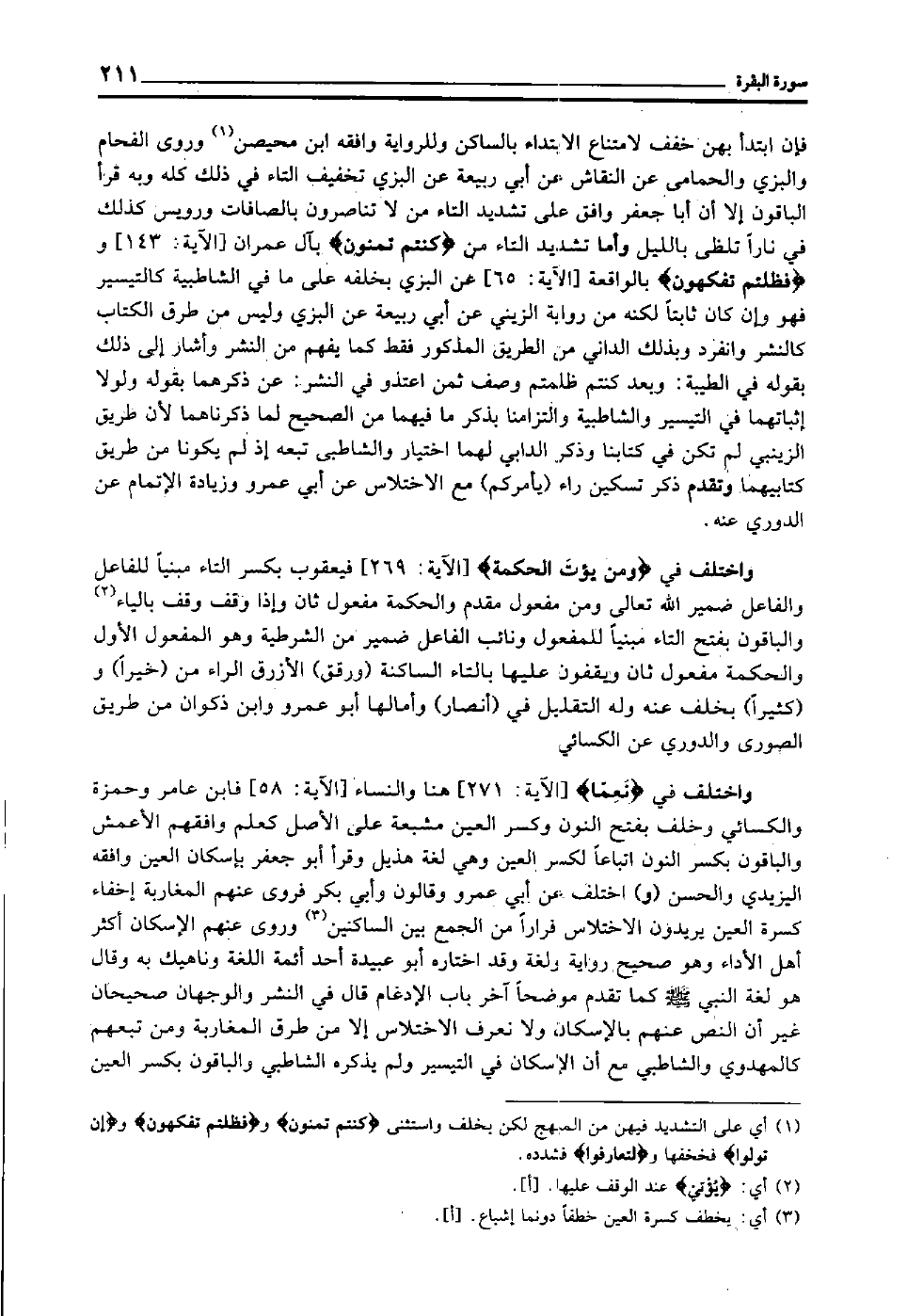 واختلف في "وَمَنْ يُؤْتَ الْحِكْمَة" [الآية: 269] فيعقوب بكسر التاء مبنيا للفاعل, والفاعل ضمير الله تعالى ومن مفعول مقدم, والحكمة مفعول ثان, وإذا وقف وقف بالياء2 والباقون بفتح التاء مبنيا للمفعول, ونائب الفاعل ضمير من الشرطية وهو المفعول الأول, والحكمة مفعول ثان, ويقفون عليها بالتاء الساكنة "ورقق" الأزرق الراء من "خيرا" و"كثيرا" بخلف عنه وله التقليل في "أنصار" وأمالها أبو عمرو وابن ذكوان من طريق الصوري والدوري عن الكسائي.