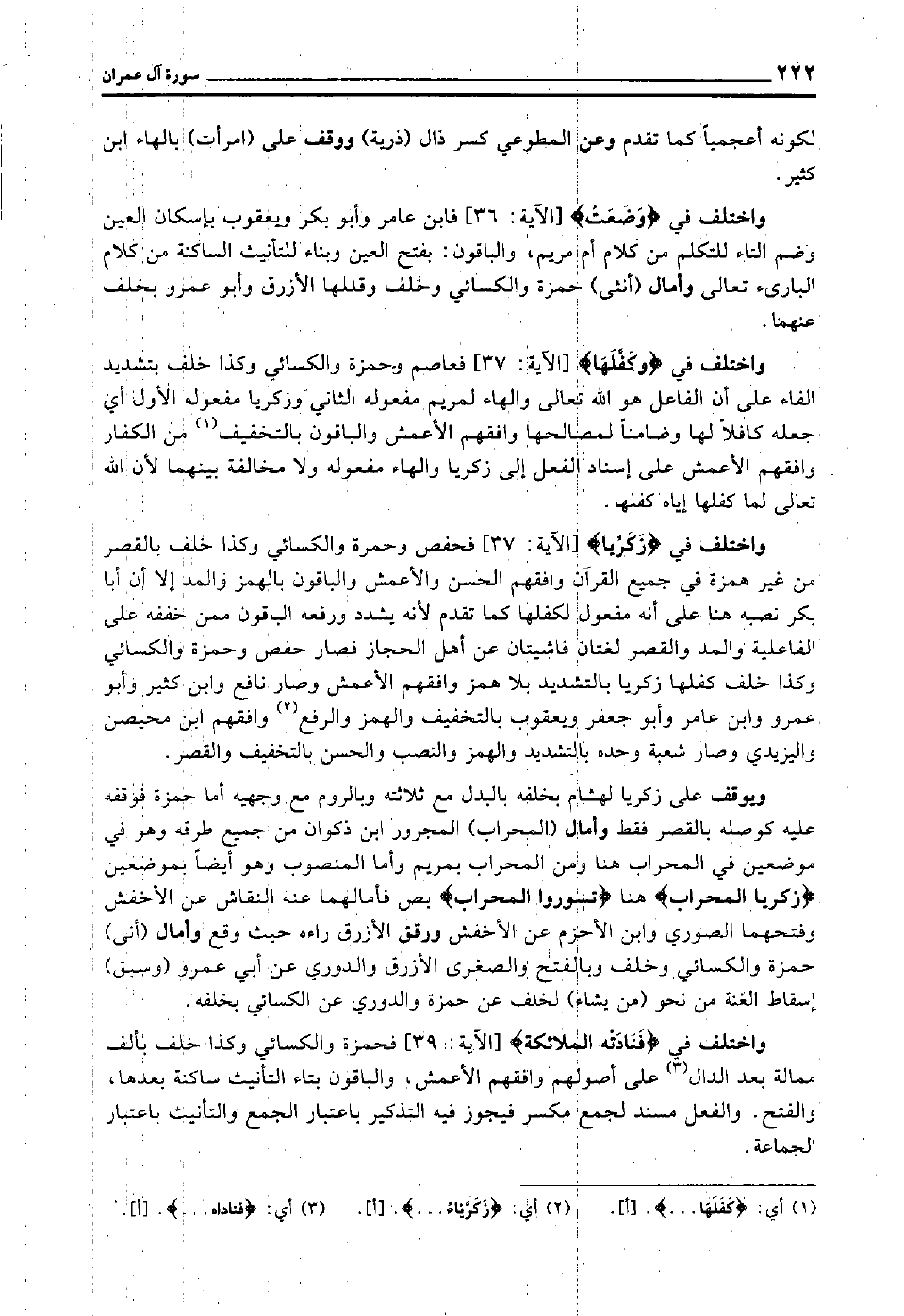 واختلف في "وكفلها" [الآية: 37] فعاصم وحمزة والكسائي وكذا خلف بتشديد الفاء على أن الفاعل هو الله تعالى, والهاء لمريم مفعوله الثاني, وزكريا مفعوله الأول أي: جعله كافلا لها وضامنا لمصالحها وافقهم الأعمش والباقون بالتخفيف1 من الكفار وافقهم الأعمش على إسناد الفعل إلى زكريا, والهاء مفعوله ولا مخالفة بينهما؛ لأن الله تعالى لما كفلها إياه كفلها.