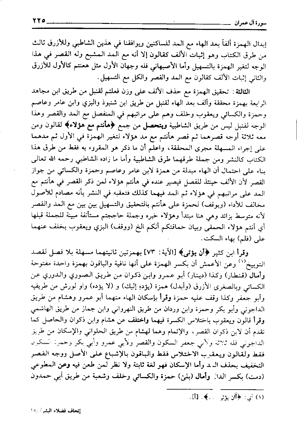 وقرأ ابن كثير "أَنْ يُؤْتَى" [الآية: 73] بهمزتين ثانيتهما مسهلة بلا فصل لقصد التوبيخ1 وعن الأعمش أن بكسر الهمزة على أنها نافية والباقون بهمزة واحدة مفتوحة وأمال "قنطار" وكذا "دينار" أبو عمرو وابن ذكوان من طريق الصوري والدوري عن الكسائي وبالصغرى الأزرق "وأبدل" همزة "يؤده إليك" و"لا يؤده" واو لورش من طريقيه وأبو جعفر وكذا وقف عليه حمزة, وقرأ بإسكان الهاء منهما أبو عمرو وهشام من طريق الداجواني وأبو بكر وحمزة وابن وردان من طريق النهرواني, وابن جماز من طريق الهاشمي وقرأ قالون ويعقوب باختلاس الكسرة فيهما, واختلف عن هشام وابن ذكوان والحاصل كما تقدم أن لابن ذكوان القصر والإتمام, وهما لهشام من طريق الحلواني والإسكان من طريق الداجواني فله ثلاثة, ولأبي جعفر السكون والقصر ولأبي عمرو وأبي بكر وحمزة السكون فقط, ولقالون ويعقوب الاختلاس فقط, والباقون بالإشباع على الأصل ووجه القصر التخفيف بحذف المد, وأما الإسكان فهو لغة ثابتة ولا نظر لمن طعن فيه وعن المطوعي "دمت" بكسر الدال وأمال "بلى" حمزة والكسائي وخلف وشعبة من طريق أبي حمدون
