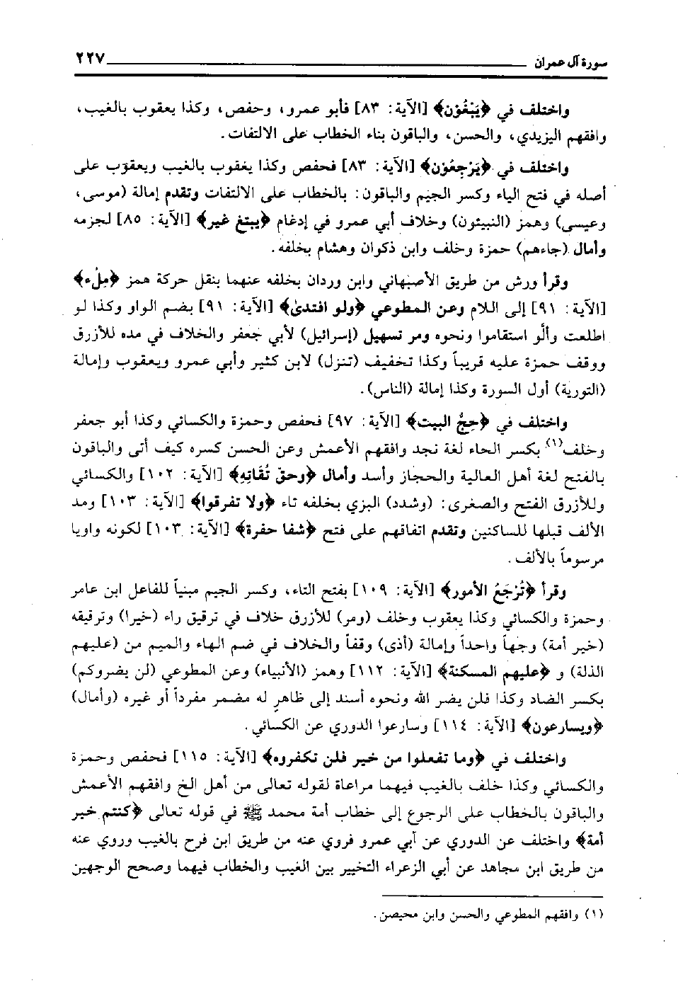 وقرأ "تُرْجَعُ الْأُمُور" [الآية: 109] بفتح التاء وكسر الجيم مبنيا للفاعل ابن عامر وحمزة والكسائي, وكذا يعقوب وخلف "ومر" للأزرق خلاف في ترقيق راء "خيرا" وترقيقه "خير أمة" وجها واحدا وإمالة "أذى" وقفا والخلاف في ضم الهاء والميم من "عليهم الذلة" و"عَلَيْهِمُ الْمَسْكَنَة" [الآية: 112] وهمز "الأنبياء" وعن المطوعي "لن يضروكم" بكسر الضاد, وكذا فلن يضر الله ونحوه, أسند إلى ظاهر له مضمر مفردا أو غيره "وأمال" "ويسارعون" [الآية: 114] وسارعوا الدوري عن الكسائي.