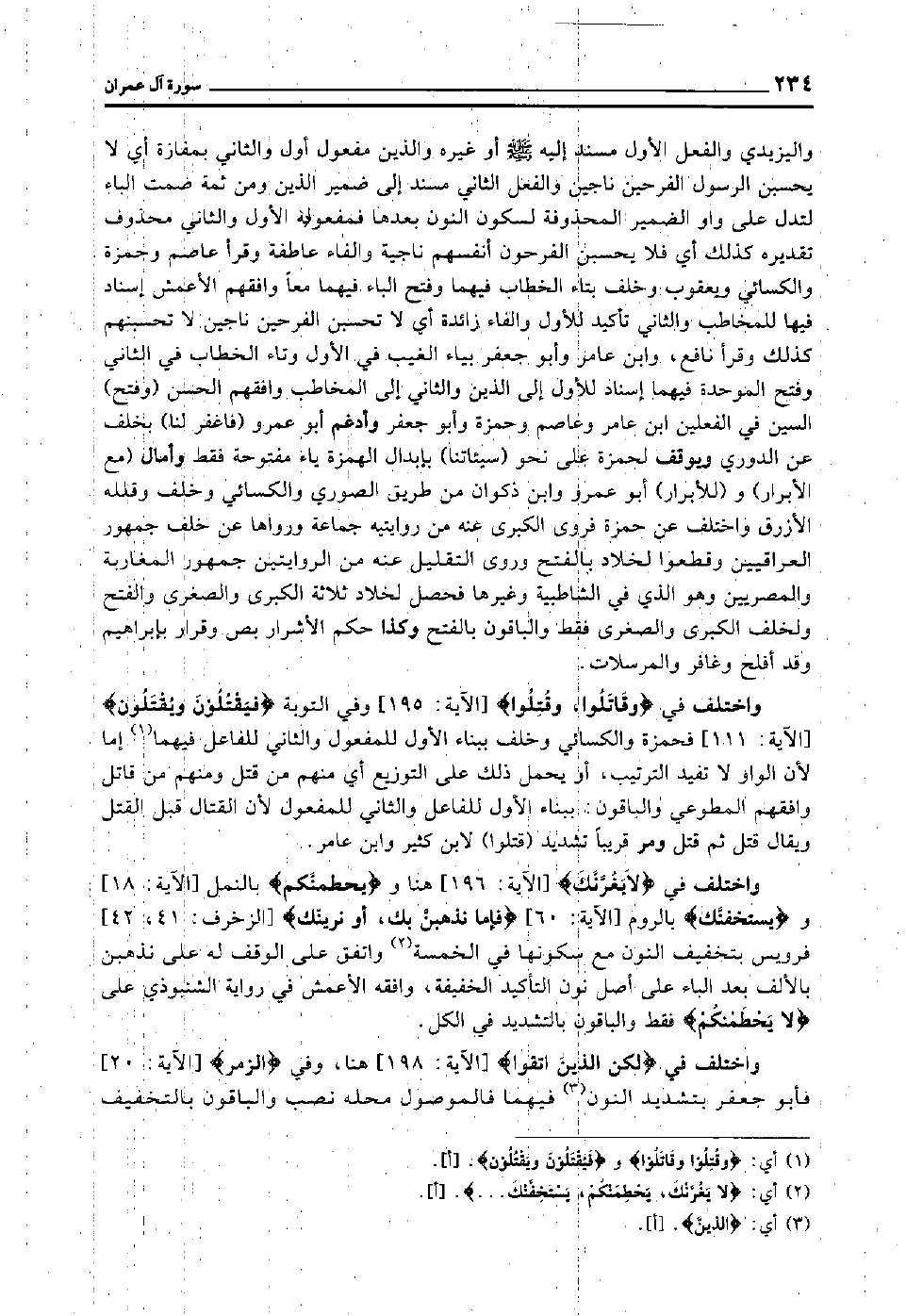 واختلف في "وَقَاتَلُوا وَقُتِلُوا" [الآية: 195] وفي التوبة "فَيَقْتُلُونَ وَيُقْتَلُون" [الآية: 111] فحمزة والكسائي وخلف ببناء الأول للمفعول والثاني للفاعل فيهما1 إما لأن الواو لا تفيد الترتيب, أو يحمل ذلك على التوزيع أي: منهم من قتل ومنهم من قاتل وافقهم المطوعي والباقون ببناء الأول للفاعل, والثاني للمفعول؛ لأن القتال قبل القتل, ويقال قتل ثم قتل ومر قريبا تشديد "قتلوا" لابن كثير وابن عامر.