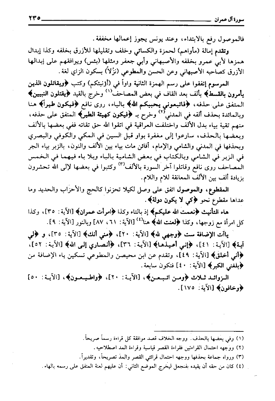 المرسوم اتفقوا على رسم الهمزة الثانية واوا في أؤنبئكم وكتب "وَيَقاتُلُونَ الَّذِينَ يَأْمُرُونَ بِالْقِسْطِ" بألف بعد القاف في بعض المصاحف1 وخرج بالقيد "يَقْتُلُونَ النَّبِيِّين" المتفق على حذفه "فَاتَّبِعُونِي يُحْبِبْكُمُ اللَّه" "بالياء روى نافع "فَيَكُونُ طَيْرًا" هنا وبالمائدة بحذف ألفه في المدني2 وخرج بـ"فيكون كهيئة الطير" المتفق على حذفه منهم تقية بياء بدل الألف, واختلفت العراقية في: اتقوا الله حق تقاته, ففي بعضها بالألف وبعضها بالحذف, سارعوا إلى مغفرة بواو قبل السين في المكي والكوفي والبصري, وبحذفها في المدني والشامي والإمام, أفائن مات بياء بين الألف والنون, بالزبر بياء الجر في الزبر في الشامي, وبالكتاب في بعض الشامية بالباء وبلا باء فيهما في الخمس المصاحف, روى نافع وقاتلوا آخر السورة بالألف3, وكتبوا في بعضها لإلى الله تحشرون بزيادة ألف بين الألف المعانقة للام واللام.