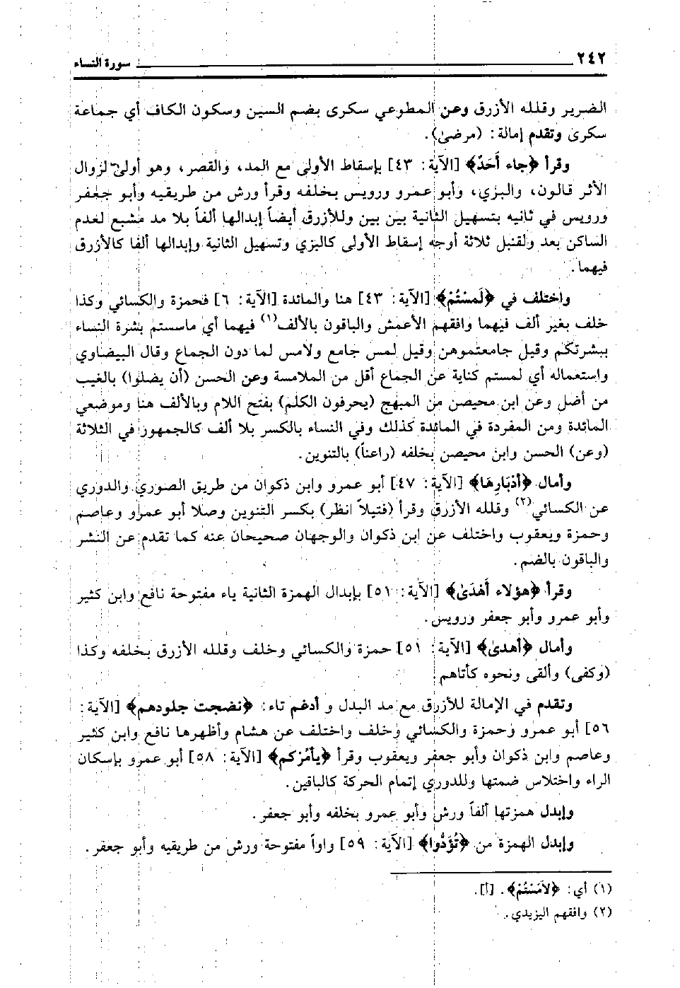 واختلف في "لمستم" [الآية: 43] هنا والمائدة [الآية: 6] فحمزة والكسائي وكذا خلف بغير ألف فيهما وافقهم الأعمش والباقون بالألف1 فيهما أي: ماسستم بشرة النساء ببشرتكم, وقيل جامعتموهن, وقيل لمس جامع ولامس لما دون الجماع, وقال البيضاوي: واستعماله أي: لمستم كناية عن الجماع أقل من الملامسة وعن الحسن "أن يضلوا" بالغيب من أضل, وعن ابن محيصن من المبهج "يحرفون الكلم" بفتح اللام وبالألف هنا وموضعي المائدة ومن المفردة في المائدة كذلك في النساء بالكسر بلا ألف كالجمهور في الثلاثة "وعن" الحسن وابن محيصن بخلفه "راعنا" بالتنوين.