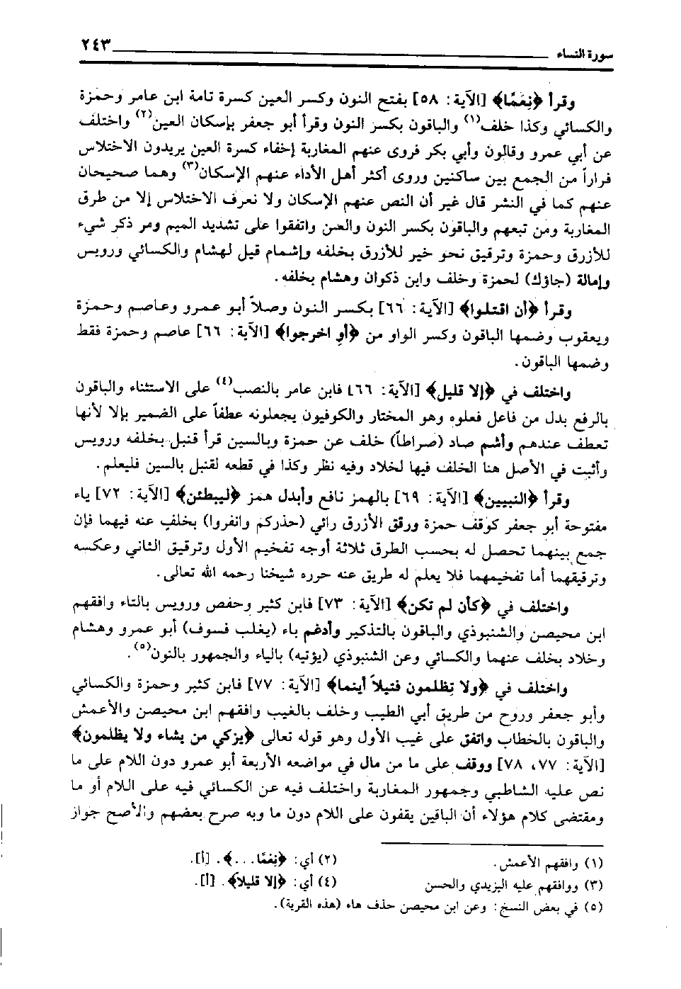 واختلف في "كَأَنْ لَمْ تَكُن" [الآية: 73] فابن كثير وحفص ورويس بالتاء وافقهم ابن محيصن والشنبوذي والباقون بالتذكير, وأدغم باء "يغلب فسوف" أبو عمرو وهشام وخلاد بخلف عنهما والكسائي وعن الشنبوذي "يؤتيه" بالياء والجمهور بالنون5.