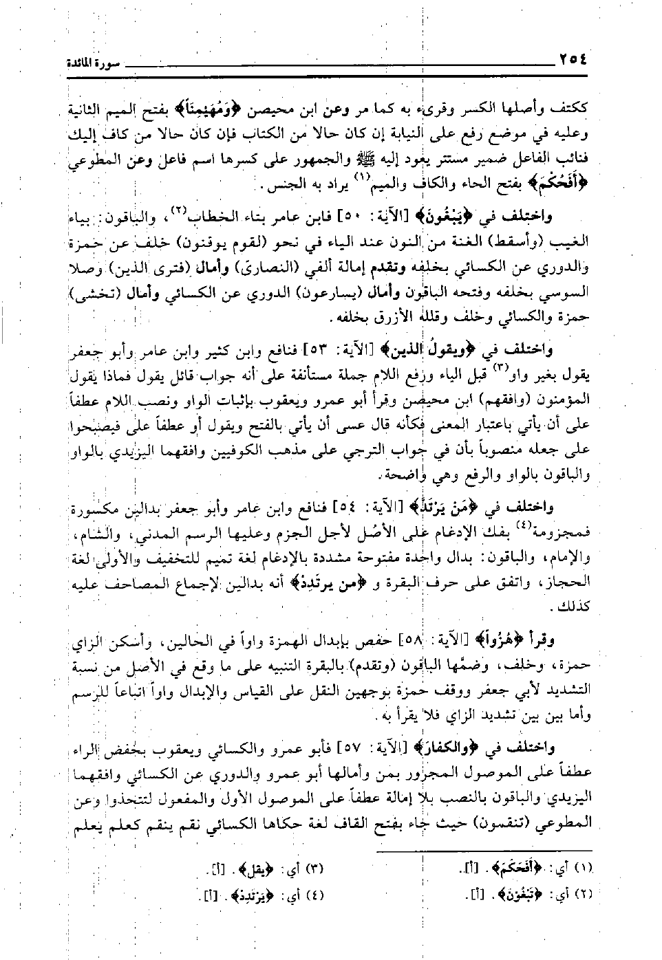 واختلف في "يبغون" [الآية: 50] فابن عامر بتاء الخطاب2 والباقون بياء الغيب "وأسقط" الغنة من النون عند الياء في نحو: "لقوم يوقنون" خلف عن حمزة والدوري عن الكسائي بخلفه, وتقدم إمالة ألفي "النصارى" وأمال "فترى الذين" وصلا السوسي بخلفه وفتحه الباقون, وأمال "يسارعون" الدوري عن الكسائي, وأمال "تخشى" حمزة والكسائي وخلف, وقلله الأزرق بخلفه.