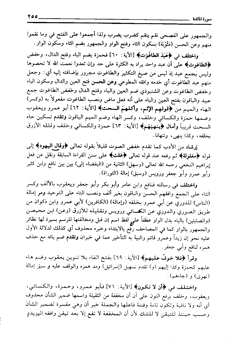 واختلف في "عبد الطاغوت" [الآية: 60] فحمزة بضم الباء وفتح الدال وخفض "الطاغوت" على أن عبد واحد يراد به الكثرة على حد: "وإن تعدوا نعمت الله لا تحصوها" وليس بجمع عبد إذ ليس من صيغ التكثير, والطاغوت مجرور بإضافته إليه أي: وجعل منهم عبد الطاغوت أي: خدمه وافقه المطوعي, وعن الحسن فتح العين والدال وسكون الباء وخفض الطاغوت, وعن الشنبوذي ضم العين والباء وفتح الدال وخفض الطاغوت, جمع عبيد, والباقون بفتح العين والباء على أنه فعل ماض ونصب الطاغوت مفعولا به "وكسر" الهاء والميم من "قولهم الإثم، وأكلهم السحت" [الآية: 62] أبو عمرو ويعقوب وضمها حمزة والكسائي وخلف, وكسر الهاء وضم الميم الباقون, وتقدم تسكين حاء السحت قريبا وأمال "ينهيهم" [الآية: 63] حمزة والكسائي وخلف وقلله الأزرق بخلفه, وكذا ينهى, وتنهانا.