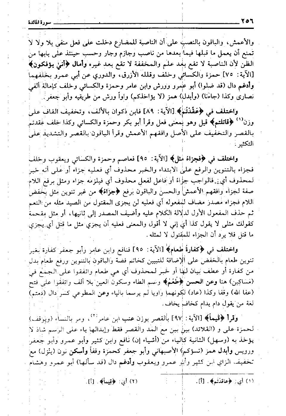 واختلف في "كَفَّارَةٌ طَعَام" [الآية: 95] فنافع وابن عامر وأبو جعفر كفارة بغير تنوين طعام بالخفض على الإضافة للتبيين, كخاتم فضة, والباقون بالتنوين, ورفع طعام بدل من كفارة أو عطف بيان لها أو خبر لمحذوف أي: هي طعام واتفقوا على الجمع في "مساكين" هنا وعن الحسن "طعم" وضم الطاء وسكون العين بلا ألف واتفقوا على فتح "عفا الله" وقفا وكذا "عاد" لكونهما واويا لم يرسما بالياء, وعن المطوعي كسر دال "دمتم" لغة من يقول دام يدام كخاف يخاف.