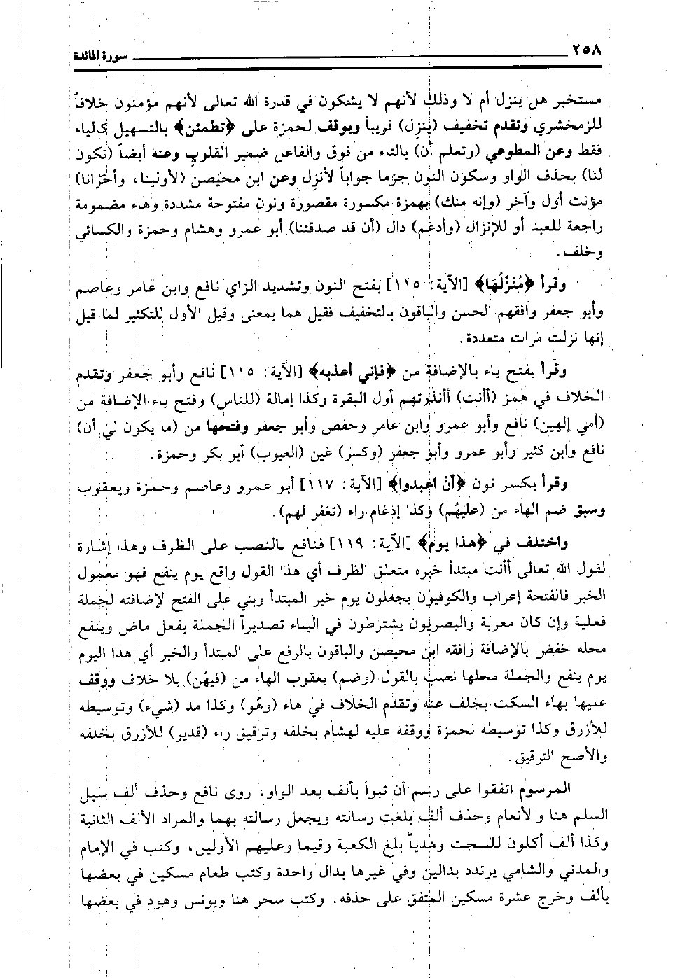 واختلف في " هَذَا يَوْم" [الآية: 119] فنافع بالنصب على الظرف, وهذا إشارة لقول الله تعالى: أأنت مبتدأ خبره متعلق الظرف أي: هذا القول واقع يوم ينفع فهو معمول الخبر, فالفتحة إعراب والكوفيون يجعلون يوم خبر المبتدأ, وبني على الفتح لإضافته لجملة فعلية, وإن كانت معربة, والبصريون يشترطون في البناء تصديرا الجملة بفعل ماض, وينفع محله خفض بالإضافة, وافقه ابن محيصن, والباقون بالرفع على المبتدأ والخبر أي: هذا اليوم يوم ينفع والجملة محلها نصب بالقول, "وضم" يعقوب الهاء من "فيهن" بلا خلاف, ووقف عليها بهاء السكت بخلف عنه. وتقدم الخلاف في هاء "وهو" وكذا مد "شيء" وتوسيطه للأزرق وكذا توسيطه لحمزة ووقفه عليه لهشام بخلفه وترقيق راء "قدير" للأزرق بخلفه والأصح الترقيق.