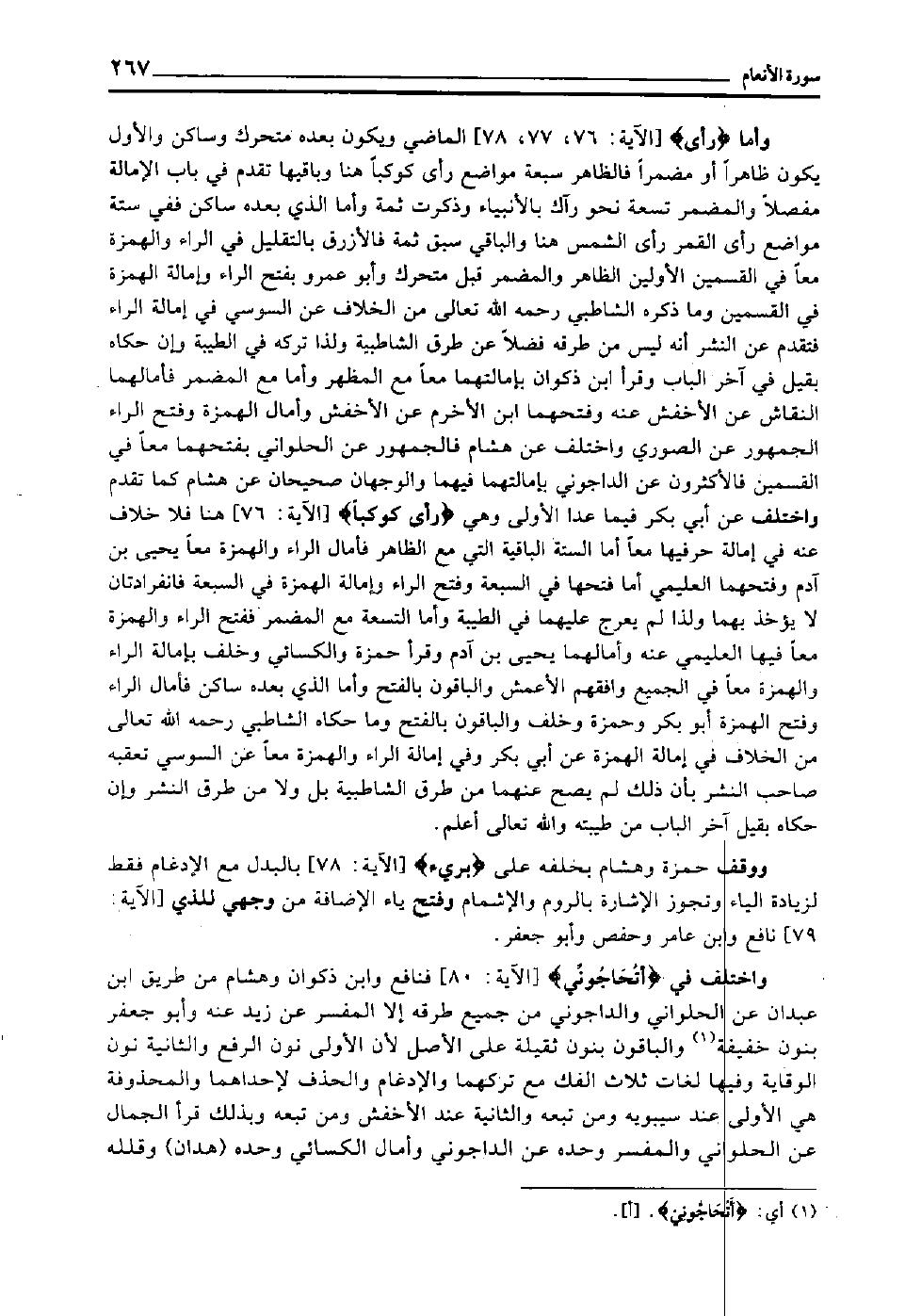 وأما "رأى" [الآية: 76، 77، 78] الماضي ويكون بعده متحرك وساكن والأول يكون ظاهرا أو مضمرا, فالظاهر سبعة مواضع: رأى كوكبا هنا, وباقيها تقدم في باب الإمالة مفصلا, والمضمر تسعة نحو: رآك بالأنبياء, وذكرت ثمة, وأما الذي بعده ساكن, ففي ستة مواضع: رأى القمر رأى الشمس هنا, والباقي سبق ثمة, فالأزرق بالتقليل في الراء والهمزة معا في القسمين الأولين الظاهر والمضمر قبل متحرك, وأبو عمرو بفتح الراء وإمالة الهمزة في القسمين, وما ذكره الشاطبي رحمه الله تعالى من الخلاف عن السوسي في إمالة الراء, فتقدم عن النشر أنه ليس من طرقه فضلا عن طرق الشاطبية, ولذا تركه في الطيبة, وإن حكاه بقيل في آخر الباب, وقرأ ابن ذكوان بإمالتهما معا مع المظهر, وأما مع المضمر فأمالهما النقاش عن الأخفش عنه, وفتحهما ابن الأخرم عن الأخفش, وأمال الهمزة وفتح الراء الجمهور عن الصوري, واختلف عن هشام فالجمهور عن الحلواني بفتحهما معا في القسمين, فالأكثرون عن الداجوني بإمالتهما فيهما والوجهان صحيحان عن هشام كما تقدم, واختلف عن أبي بكر فيما عدا الأولى وهي "رَأى كَوْكَبًا" [الآية: 76] هنا فلا خلاف عنه في إمالة حرفيها معا أما الستة الباقية التي مع الظاهر فأمال الراء والهمزة معا يحيى بن آدم, وفتحهما العليمي, أما فتحها في السبعة وفتح الراء وإمالة الهمزة في السبعة فانفرادتان, لا يؤخذ بهما, ولذا لم يعرج عليهما في الطيبة, وأما التسعة مع المضمر ففتح الراء والهمزة معا فيها العليمي عنه, وأمالهما يحيى بن آدم وقرأ حمزة والكسائي وخلف بإمالة الراء والهمزة معا في الجميع, وافقهم الأعمش, والباقون بالفتح, وأما الذي بعده ساكن فأمال الراء وفتح الهمزة أبو بكر وحمزة وخلف, والباقون بالفتح وما حكاه الشاطبي رحمه الله تعالى من الخلاف في إمالة الهمزة عن أبي بكر وفي إمالة الراء والهمزة معا عن السوسي, تعقبه صاحب النشر بأن ذلك لم يصح عنهما من طرق الشاطبية, بل ولا من طرق النشر وإن حكاه بقيل آخر الباب من طيبته والله تعالى أعلم.