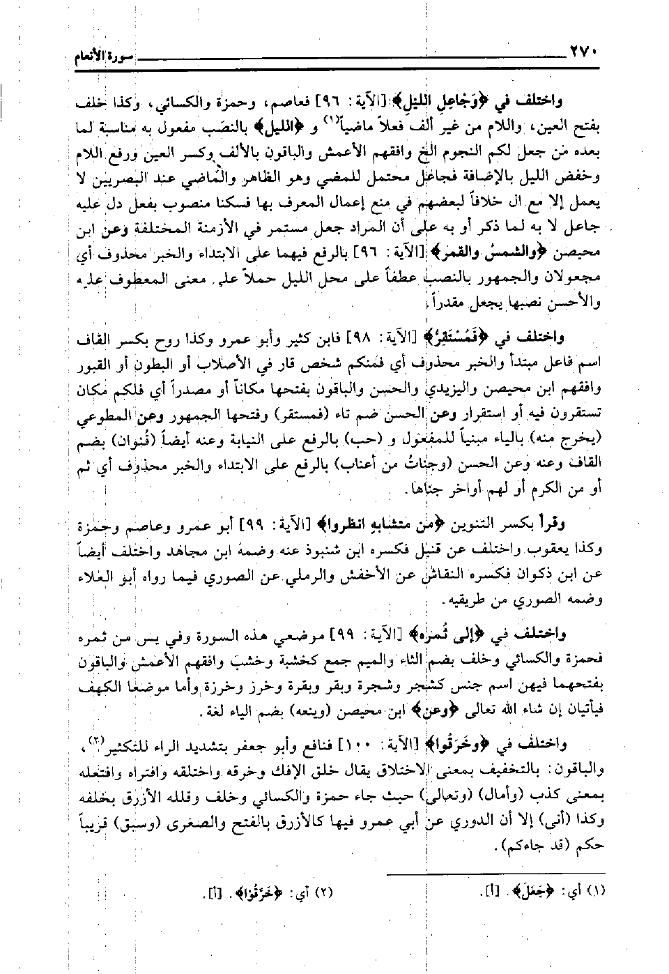 واختلف في "وخرقوا" [الآية: 100] فنافع وأبو جعفر بتشديد الراء للتكثير2, والباقون بالتخفيف بمعنى الاختلاق يقال خلق الإفك وخرقه واختلقه وافتراه وافتعله بمعنى كذب "وأمال" "وتعالى" حيث جاء حمزة والكسائي وخلف, وقلله الأزرق بخلفه وكذا "أنى" إلا أن الدوري عن أبي عمرو فيها كالأزرق بالفتح والصغرى "وسبق" قريبا حكم "قد جاءكم".