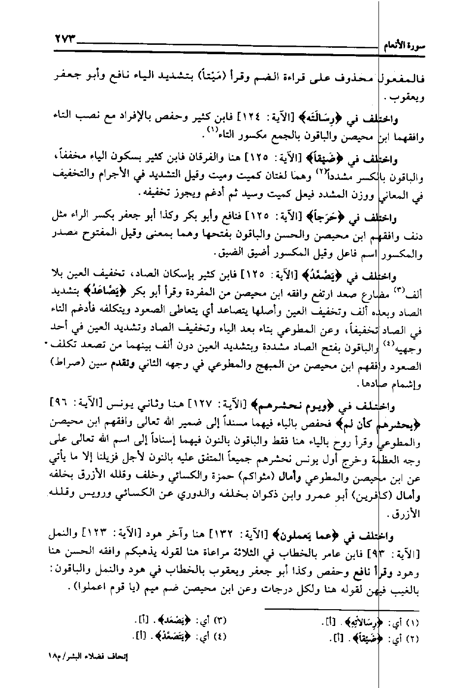 واختلف في "يصعد" [الآية: 125] فابن كثير بإسكان الصاد تخفيف العين بلا ألف3 مضارع صعد ارتفع وافقه ابن محيصن من المفردة, وقرأ أبو بكر "يصاعد" بتشديد الصاد وبعده ألف وتخفيف العين وأصلها يتصاعد أي: يتعاطى الصعود ويتكلفه فأدغم التاء في الصاد تخفيفا, وعن المطوعي بتاء بعد الياء وتخفيف الصاد وتشديد العين في أحد وجهيه4, والباقون بفتح الصاد مشددة وبتشديد العين دون ألف بينهما من تصعد تكلف الصعود وافقهم ابن محيصن من المبهج والمطوعي في وجهه الثاني, وتقدم سين صراط وإشمام صادها.