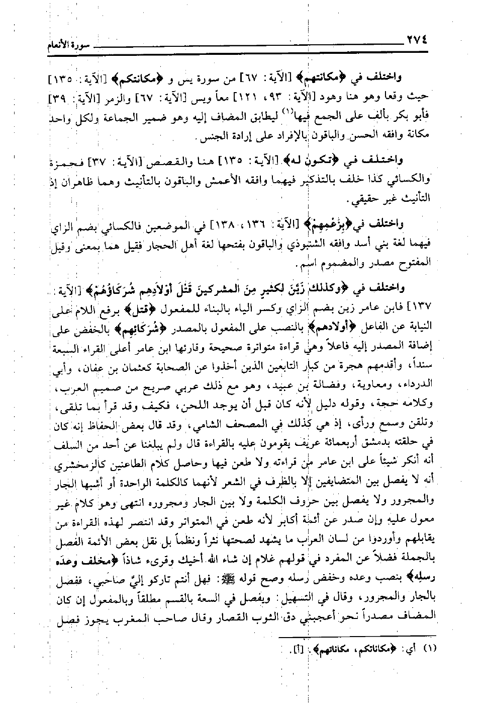 واختلف في {وَكَذَلِكَ زَيَّنَ لِكَثِيرٍ مِنَ الْمُشْرِكِينَ قَتْلَ أَوْلادِهِمْ شُرَكَاؤُهُمْ} [الآية: 137] فابن عامر زين بضم الزاي وكسر الياء بالبناء للمفعول "قتل" برفع اللام على النيابة عن الفاعل "أولادهم" بالنصب على المفعول بالمصدر "شركائهم" بالخفض على إضافة المصدر إليه فاعلا, وهي قراءة متواترة صحيحة وقارئها ابن عامر أعلى القراء السبعة سندا وأقدمهم هجرة, من كبار التابعين الذين أخذوا عن الصحابة كعثمان بن عفان وأبي الدرداء ومعاوية وفضالة بن عبيد, وهو مع ذلك عربي صريح من صميم العرب, وكلامه حجة وقوله دليل؛ لأنه كان قبل أن يوجد اللحن, فكيف وقد قرأ بما تلقى وتلقن وسمع ورأى, إذ هي كذلك في المصحف الشامي, وقد قال بعض الحفاظ: إنه كان في حلقته بدمشق أربعمائة عريف يقومون عليه بالقراءة, قال: ولم يبلغنا عن أحد من السلف أنه أنكر شيئا على ابن عامر من قراءته ولا طعن فيها, وحاصل كلام الطاعنين كالزمخشري أنه لا يفصل بين المتضايفين إلا بالظرف في الشعر؛ لأنهما كالكلمة الواحدة أو أشبها الجار والمجرور, ولا يفصل بين حروف الكلمة ولا بين الجار ومجروره ا. هـ. وهو كلام غير معول عليه, وإن صدر عن أئمة أكابر؛ لأنه طعن في المتواتر, وقد انتصر لهذه القراءة من يقابلهم, وأوردوا من لسان العرب ما يشهد لصحتها نثرا ونظما بل نقل بعض الأئمة الفصل بالجملة فضلا عن المفرد في قولهم غلام إن شاء الله أخيك وقرئ شاذا "مُخْلِفَ وَعْدَه رُسُلَه" بنصب وعده وخفض رسله, وصح قوله -صلى الله عليه وسلم: "فهل أنتم تاركو إلي صاحبي" , ففصل بالجار والمجرور, وقال في التسهيل: ويفصل في السعة بالقسم مطلقا وبالمفعول إن كان المضاف مصدرا نحو: أعجبني دق الثوب القصار, وقال صاحب المغرب: يجوز فصل