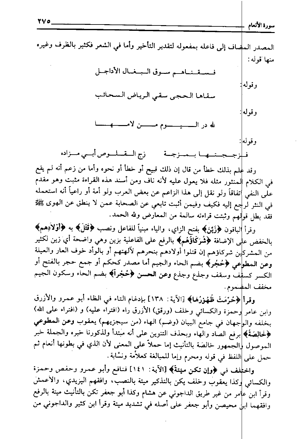 وقرأ الباقون "زَين" بفتح الزاي والياء مبنيا للفاعل ونصب "قتل" به "أولادهم" بالخفض على الإضافة "شركاؤهم" بالرفع على الفاعلية بزين, وهي واضحة أي: زين لكثير من المشركين شركاؤهم إن قتلوا أولادهم بنحرهم لآلهتهم, أو بالوأد خوف العار والعيلة, وعن المطوعي "حجر" بضم الحاء والجيم, أما مصدر كحكم أو جمع حجر بالفتح أو الكسر كسقف وسقف وجذع وجذع, وعن الحسن "حجرا" بضم الحاء وسكون الجيم مخفف المضموم.
