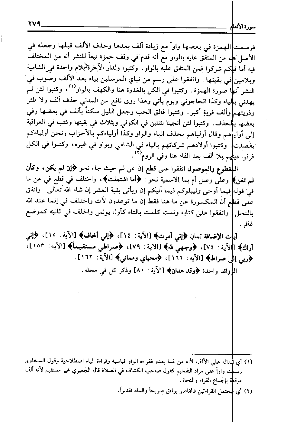 فرسمت الهمزة في بعضها واوا مع زيادة ألف بعدها وحذف الألف قبلها, وجعله في الأصل هنا من المتفق عليه بالواو, مع أنه قدم في وقف حمزة تبعا للنشر أنه من المختلف فيه, أما فيكم شركوا فمن المتفق عليه بالواو, وكتبوا ولدار الآخرة بلام واحدة في الشامية وبلامين في بقيتها, واتفقوا على رسم من نباي المرسلين بياء بعد الألف وصوب في النشر أنها صورة الهمزة, وكتبوا في الكل بالغدوة هنا والكهف بالواو1, وكتبوا لئن لم يهدني بالياء, وكذا اتحاجوني ويوم يأتي وهذا روى نافع عن المدني, حذف ألف ولا طئر وذريتهم وألف قرية أكبر, وكتبوا فالق الحب وجعل الليل سكنا بألف في بعضها وفي بعضها بالحذف, وكتبوا لئن أنجينا بثنتين في الكوفي وبثلاث في بقيتها, وكتب في العراقية إلى أولياهم, وقال: أولياهم بحذف الياء والواو وكذا أولياءكم بالأحزاب, ونحن أولياءكم بفصلت, وكتبوا أولادهم شركائهم بالياء في الشامي وبواو في غيره, وكتبوا في الكل فرقوا دينهم بلا ألف بعد الفاء هنا وفي الروم2.