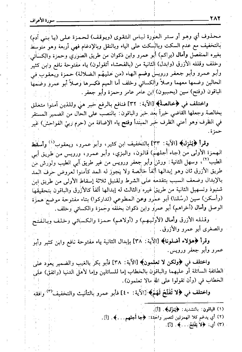 محذوف أي: وهو أو ستر العورة لباس التقوى "ويوقف" لحمزة على "يا بني آدم" بالتخفيف مع عدم السكت وبالسكت على الياء, وبالنقل وبالإدغام فهي أربعة وهو متوسط بغيره المنفصل, وأمال "يراكم" أبو عمرو وابن ذكوان من طريق الصوري وحمزة والكسائي وخلف, وقلله الأزرق "وأبدل" الثانية من "بالفحشاء أتقولون" ياء مفتوحة نافع وابن كثير وأبو عمرو وأبو جعفر ورويس وضم الهاء "من عليهم الضلالة" حمزة ويعقوب في الحالين وضمها معهما وصلا والكسائي وخلف, أما الميم فكسرها وصلا أبو عمرو وضمها الباقون "وفتح" سين "يحسبون" ابن عامر عامر وحمزة وأبو جعفر.