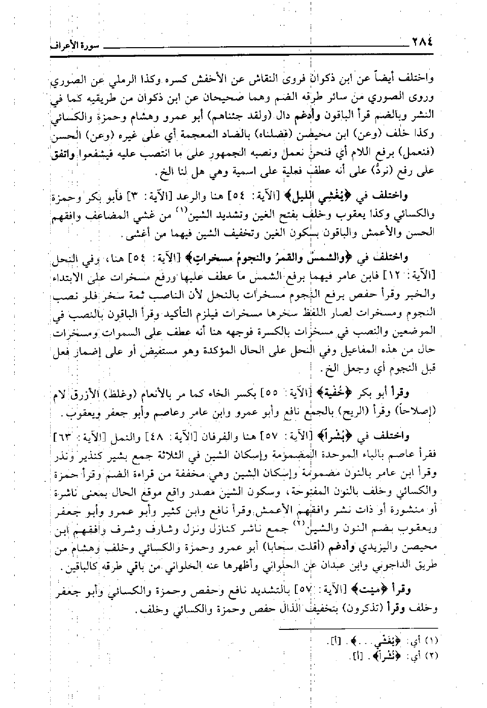 واختلف في "يُغْشِي اللَّيْل" [الآية: 54] هنا و [الرعد الآية: 3] فأبو بكر وحمزة والكسائي, وكذا يعقوب وخلف بفتح الغين وتشديد الشين1 من غشي المضاعف, وافقهم الحسن والأعمش, والباقون بسكون الغين وتخفيف الشين فيهما من أغشى.