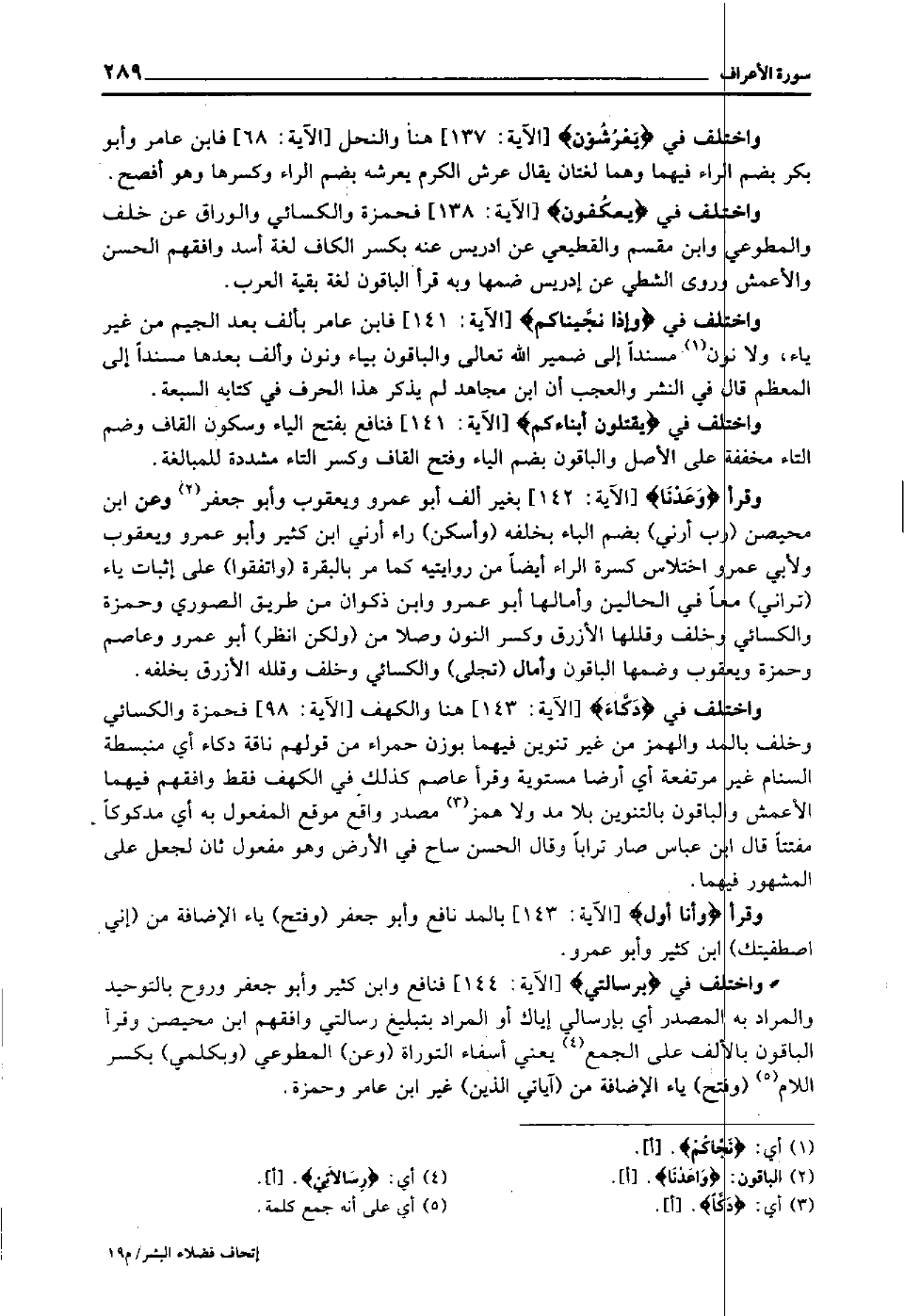 واختلف في "وَإِذْ نَجَّيْنَاكُم" [الآية: 141] فابن عامر بألف بعد الجيم من غير ياء ولا نون1 مسندا إلى ضمير الله تعالى, والباقون بياء ونون وألف بعدها مسندا إلى المعظم, قال في النشر: والعجب أن ابن مجاهد لم يذكر هذا الحرف في كتابه السبعة.
