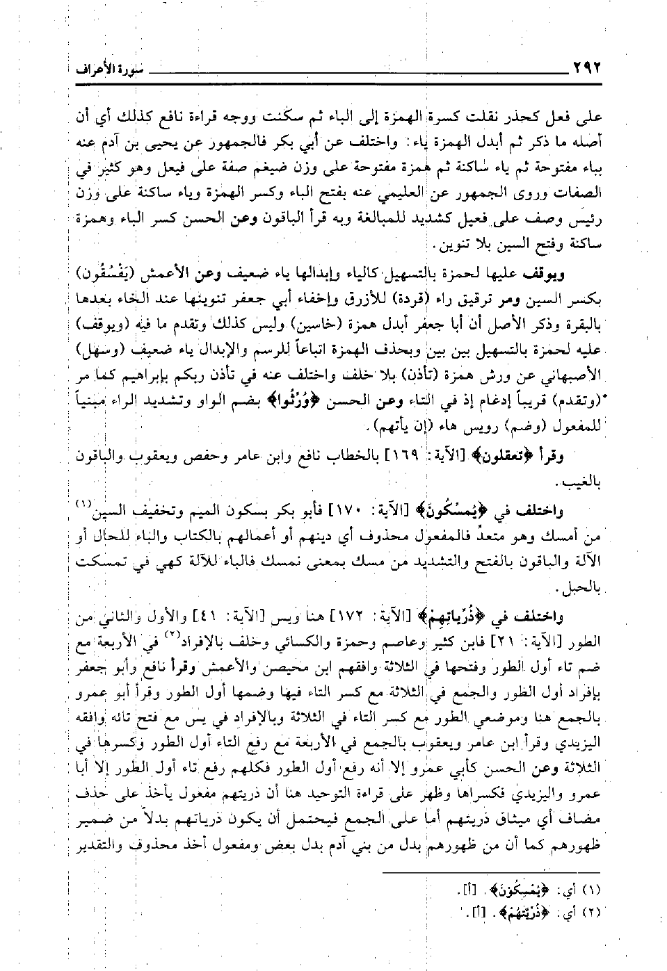 ويوقف عليها لحمزة بالتسهيل كالياء وإبدالها ياء ضعيف, وعن الأعمش "يفسقون" بكسر السين, ومر ترقيق راء "قردة" للأزرق وإخفاء أبي جعفر تنوينها عند الخاء بعدها بالبقرة, وذكر الأصل أن أبا جعفر أبدل همزة "خاسين" وليس كذلك, وتقدم ما فيه "ويوقف" عليه لحمزة بالتسهيل بين بين وبحذف الهمزة اتباعا للرسم والإبدال ياء ضعيف "وسهل" الأصبهاني عن ورش همزة "تأذن" بلا خلف واختلف عنه في تأذن ربكم بإبراهيم كما مر "وتقدم" قريبا إدغام إذ في التاء وعن الحسن "ورثوا" بضم الواو وتشديد الراء مبنيا للمفعول "وضم" رويس هاء "إن يأتهم".