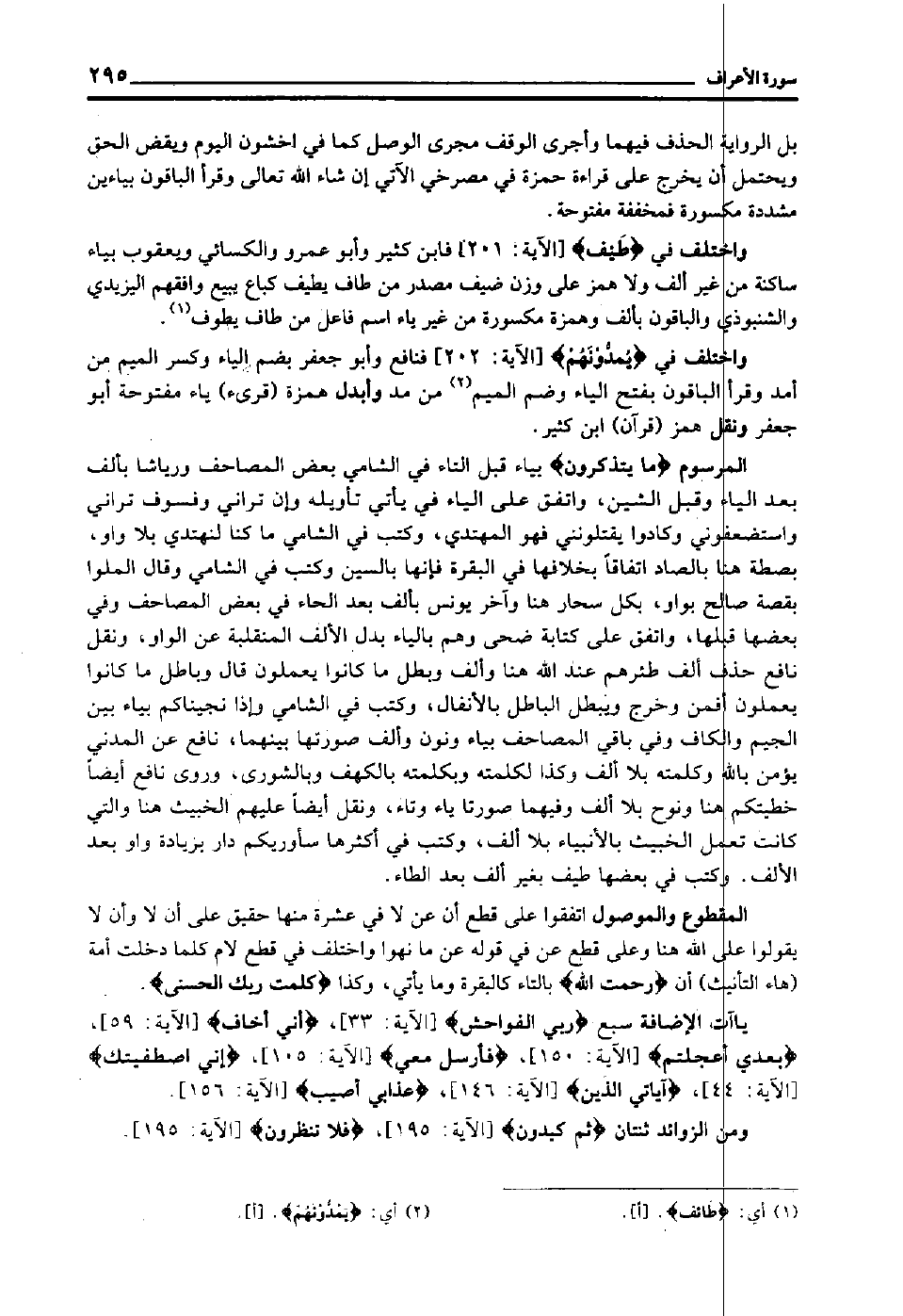 واختلف في "يُمدُّونهم" [الآية: 202] فنافع وأبو جعفر بضم الياء وكسر الميم من أمد, وقرأ الباقون بفتح الياء وضم الميم2 من مد وأبدل همزة "قرئ" ياء مفتوحة أبو جعفر ونقل همز "قرآن" ابن كثير.