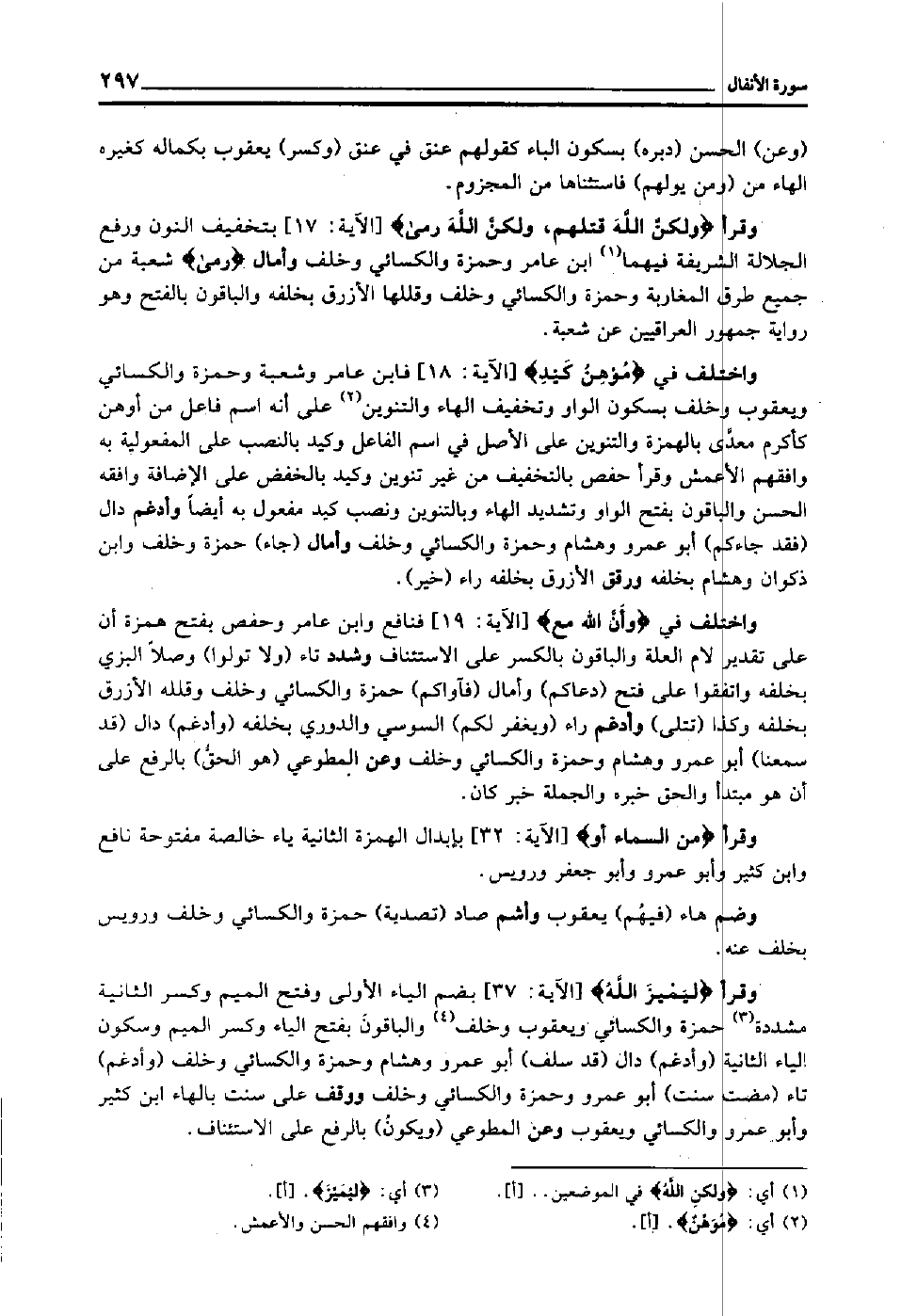 وقرأ "ولكن الله قتلهم، ولكن الله رمى" [الآية: 17] بتخفيف النون ورفع الجلالة الشريفة فيهما1 ابن عامر وحمزة والكسائي وخلف, وأمال "رمى" شعبة من جميع طرق المغاربة وحمزة والكسائي وخلف, وقللها الأزرق بخلفه, والباقون بالفتح وهو رواية جمهور العراقيين عن شعبة.