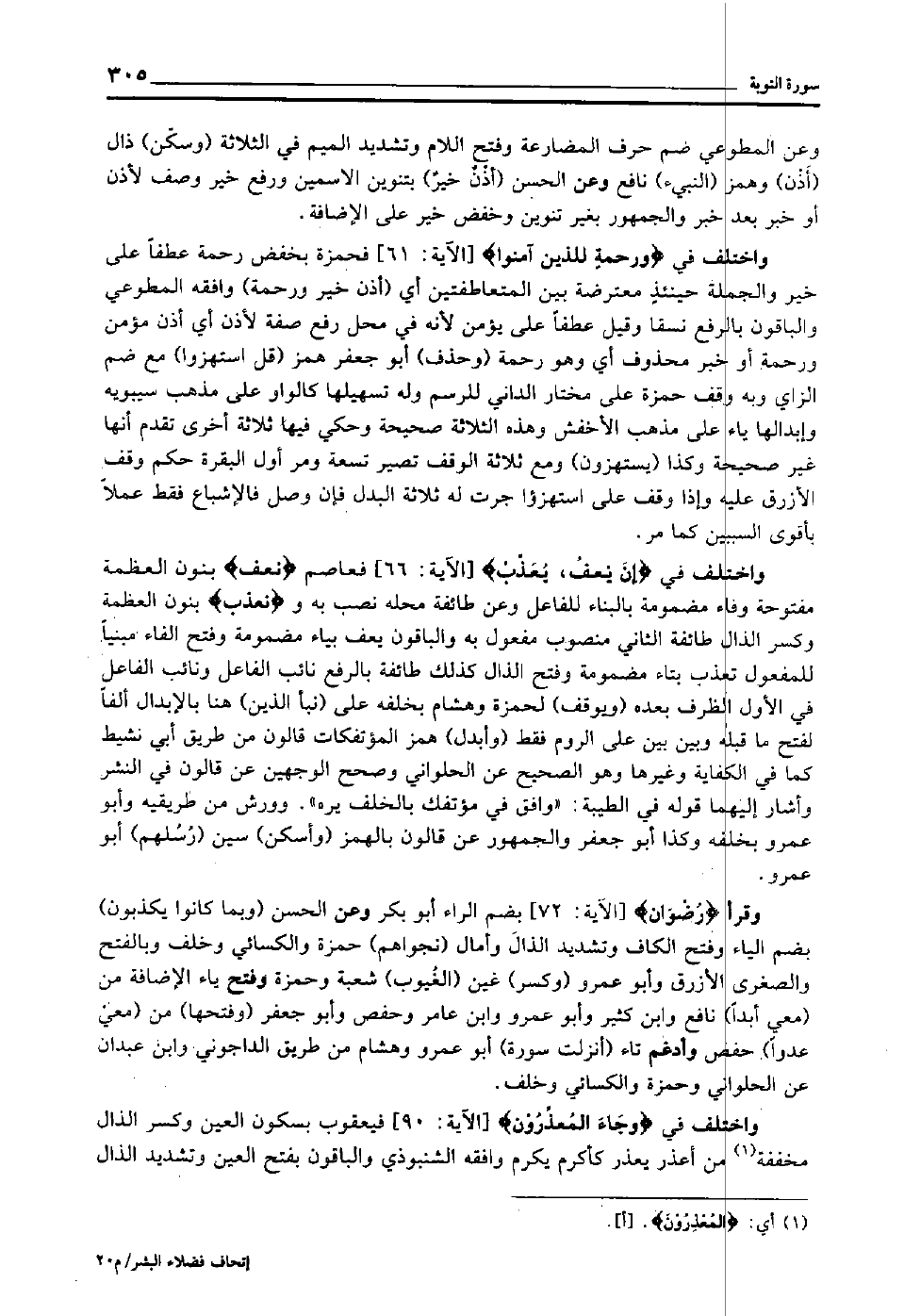 واختلف في "إن يعفُ، يُعَذِّب" [الآية: 66] فعاصم "نعف" بنون العظمة مفتوحة وفاء مضمومة بالبناء للفاعل, وعن طائفة محله نصب به و"نعذب" بنون العظمة وكسر الذال طائفة الثاني منصوب مفعول به, والباقون يعف بياء مضمومة وفتح الفاء مبنيا للمفعول, تعذب بتاء مضمومة وفتح الذال كذلك طائفة بالرفع نائب الفاعل, ونائب الفاعل في الأول الظرف بعده "ويوقف" لحمزة وهشام بخلفه على "نبأ الذين" هنا بالإبدال ألفا لفتح ما قبله, وبين بين على الروم فقط "وأبدل" همز المؤتفكات قالون من طريق أبي نشيط كما في الكفاية وغيرها, وهو الصحيح عن الحلواني, وصحح الوجهين عن قالون في النشر, وأشار إليهما قوله في الطيبة: "وافق في مؤتفك بالخلف يره".