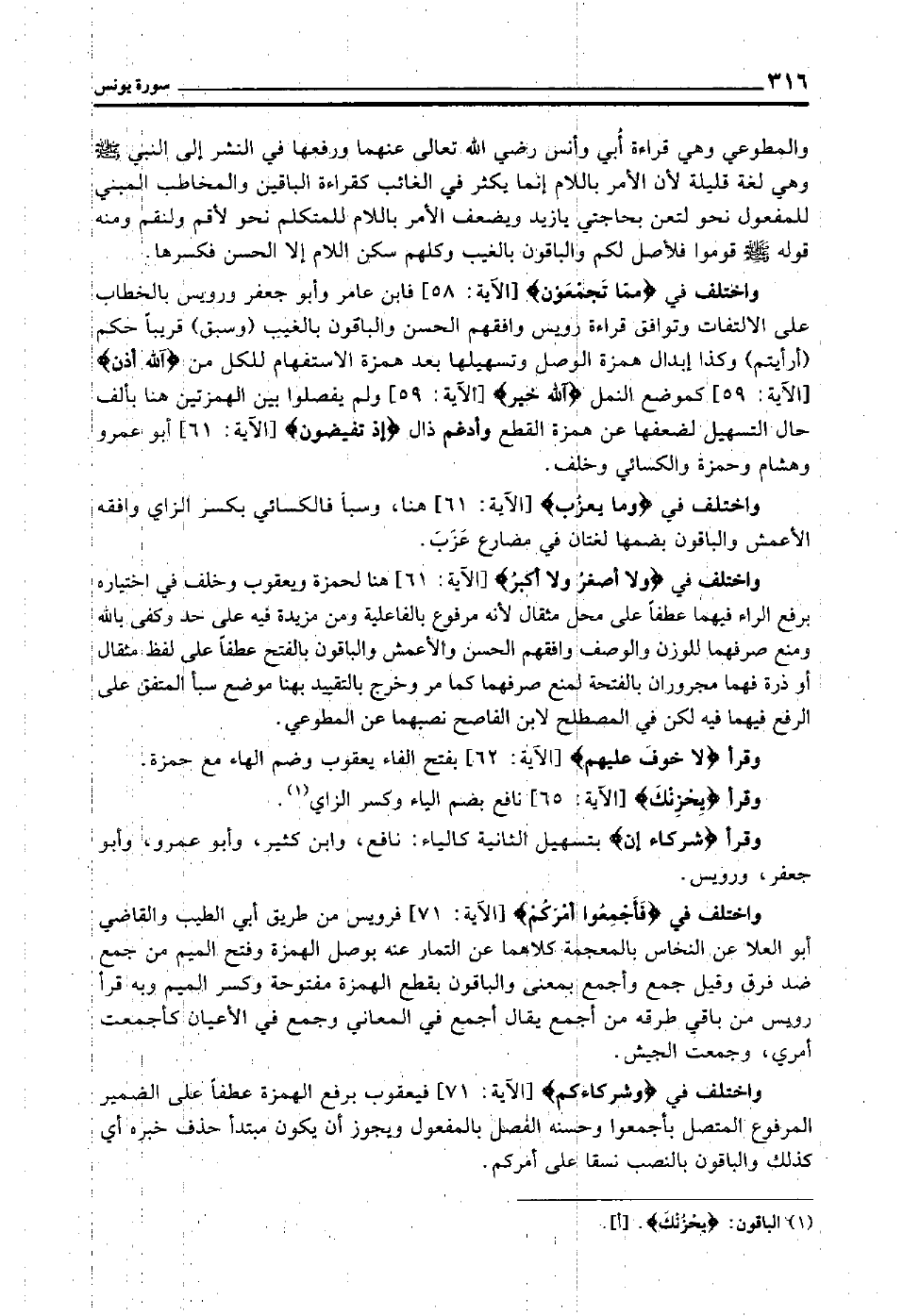 واختلف في "وَلا أَصْغَر وَلا أَكْبَر" [الآية: 61] هنا لحمزة ويعقوب وخلف في اختياره برفع الراء فيهما عطفا على محل مثقال؛ لأنه مرفوع بالفاعلية, ومن مزيدة فيه على حد وكفى بالله, ومنع صرفهما للوزن والوصف, وافقهم الحسن والأعمش والباقون بالفتح عطفا على لفظ مثقال أو ذرة, فهما مجروران بالفتحة لمنع صرفهما كما مر وخرج بالتقييد بهنا موضع سبأ المتفق على الرفع فيهما فيه, لكن في المصطلح لابن الفاصح نصبهما عن المطوعي.