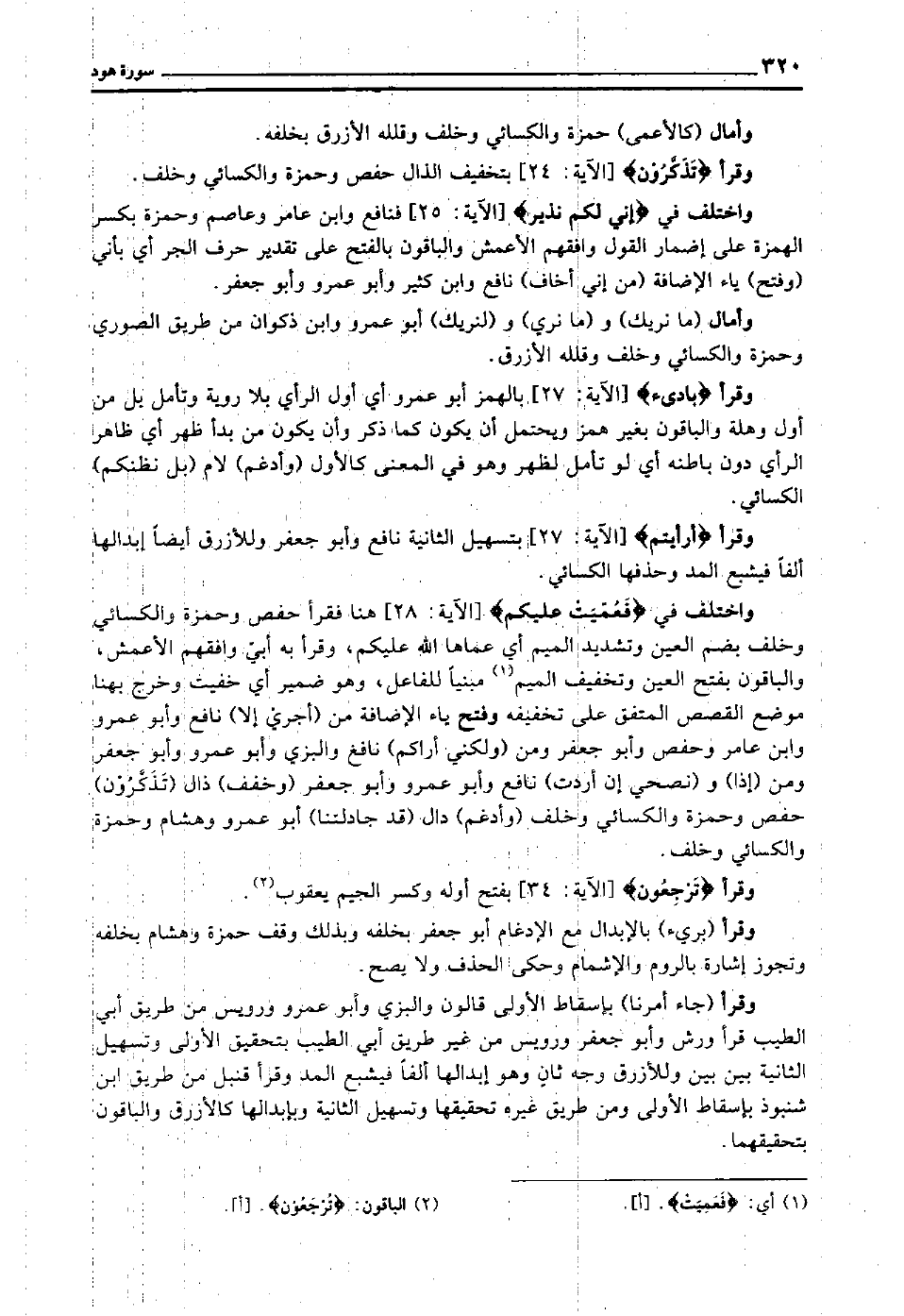 واختلف في "فَعُمِّيَتْ عَلَيْكُم" [الآية: 28] هنا فقرأ حفص وحمزة والكسائي وخلف بضم العين وتشديد الميم أي: عماها الله عليكم, وقرأ به أبي وافقهم الأعمش, والباقون بفتح العين وتخفيف الميم1 مبنيا للفاعل, وهو ضمير أي: خفيت وخرج بهنا موضع القصص المتفق على تخفيفه وفتح ياء الإضافة من "أجري إلا" نافع وأبو عمرو وابن عامر وحفص وأبو جعفر ومن "ولكني أراكم" نافع والبزي وأبو عمرو وأبو جعفر ومن "إذا" و"نصحي إن أردت" نافع وأبو عمرو وأبو جعفر "وخفف" ذال "تذكرون" حفص وحمزة والكسائي وخلف "وأدغم" دال "قد جادلتنا" أبو عمرو وهشام وحمزة والكسائي وخلف.