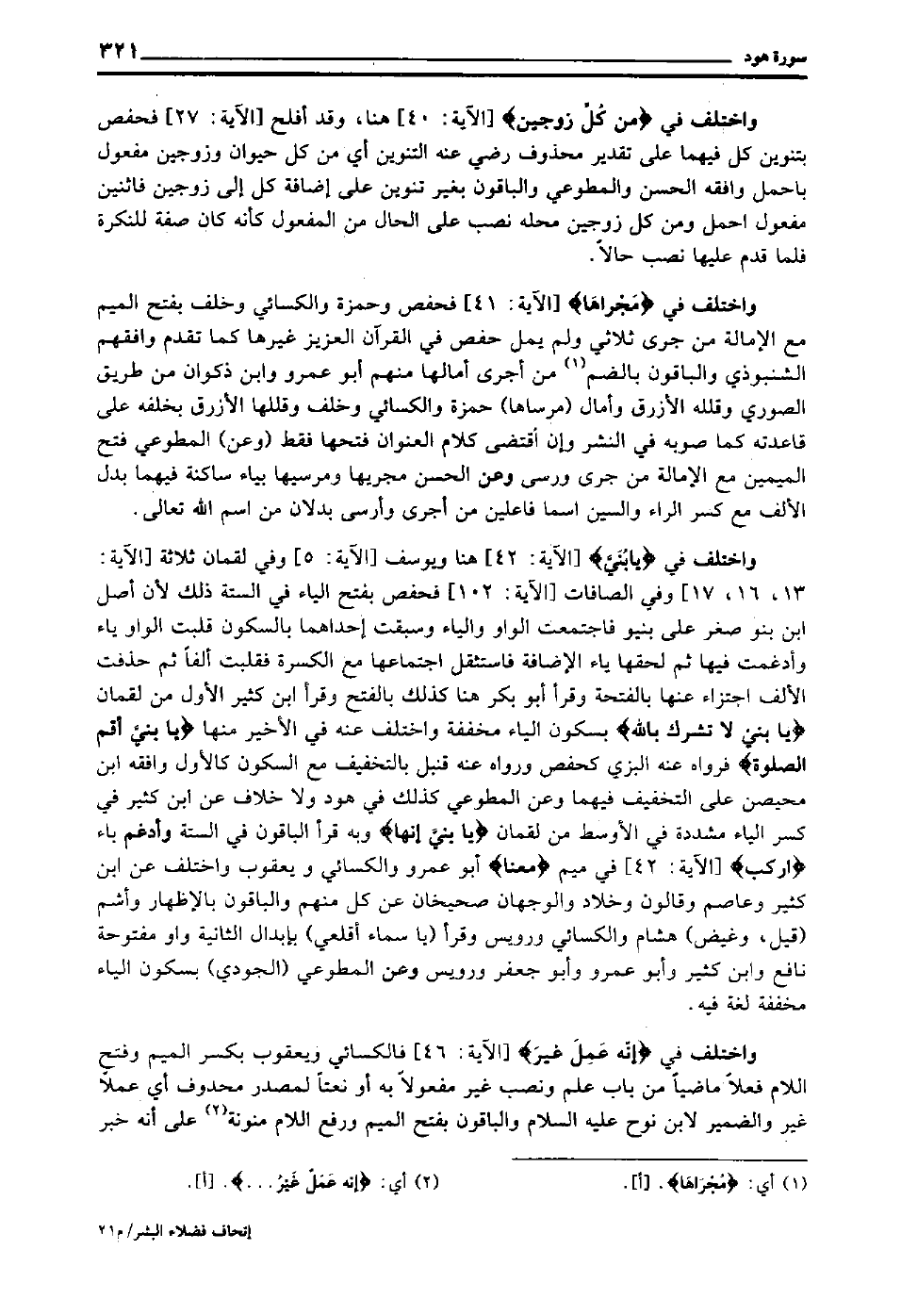 واختلف في "مَجْرَاهَا" [الآية: 41] فحفص وحمزة والكسائي وخلف بفتح الميم مع الإمالة من جرى ثلاثي ولم يمل حفص في القرآن العزيز غيرها, كما تقدم وافقهم الشنبوذي, والباقون بالضم1 من أجرى أمالها منهم أبو عمرو وابن ذكوان من طريق الصوري, وقلله الأزرق, وأمال "مرساها" حمزة والكسائي وخلف, وقللها الأزرق بخلفه على قاعدته, كما صوبه في النشر, وإن اقتضى كلام العنوان فتحها فقط, "وعن" المطوعي فتح الميمين مع الإمالة من جرى ورسى, وعن الحسن مجريها ومرسيها بياء ساكنة فيهما بدل الألف مع كسر الراء والسين اسما فاعلين من أجرى وأرسى بدلان من اسم الله تعالى.