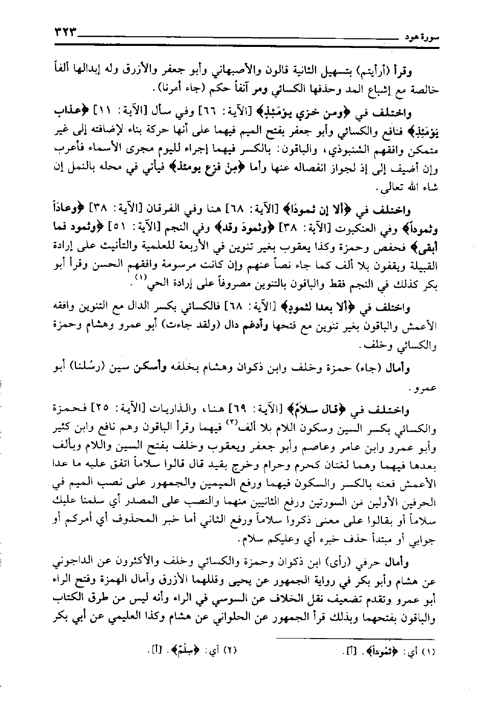 واختلف في "أَلا إِنَّ ثَمُودا" [الآية: 68] هنا وفي [الفرقان الآية: 38] "وَعَادًا وَثَمُودَا" وفي [العنكبوت الآية: 38] "وَثَمُودَ وَقَد" وفي [النجم الآية: 51] "وَثَمُودَ فَمَا أَبْقَى" فحفص وحمزة وكذا يعقوب بغير تنوين في الأربعة للعلمية والتأنيث على إرادة القبيلة, ويقفون بلا ألف كما جاء نصا عنهم, وإن كانت مرسومة وافقهم الحسن,