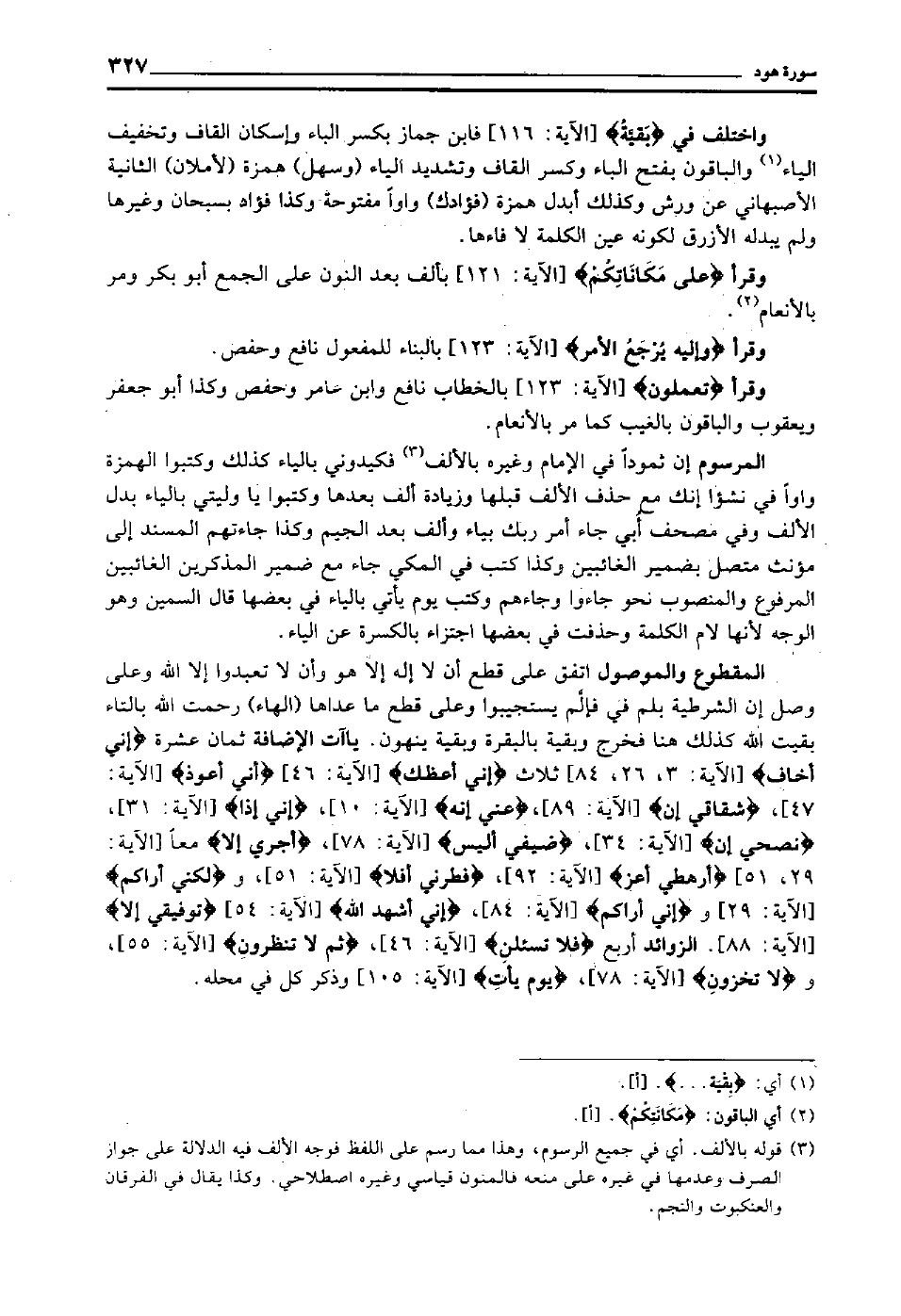 المقطوع والموصول اتفق على قطع أن لا إله إلا هو, وأن لا تعبدوا إلا الله, وعلى وصل إن الشرطية بلم في: فإلم يستجيبوا وعلى قطع ما عداها "الهاء" رحمت الله بالتاء بقيت الله كذلك هنا, فخرج وبقية بالبقرة وبقية ينهون ياءات الإضافة ثمان عشرة "إِنِّي أَخَاف" [الآية: 3، 26، 84] ثلاث "إِنِّي أَعِظُك" [الآية: 46] "إِنِّي أَعُوذ" [الآية: 47] "شِقَاقِي إن" [الآية: 89] "عَنِّي إِنَّه" [الآية: 10] "إِنِّي إِذًا" [الآية: 31] "نُصْحِي إِن" [الآية: 34] "ضَيْفِي أَلَيْس" [الآية: 78] "أَجْرِيَ إِلَّا" معا [الآية: 29، 51] "أَرَهْطِي أَعَز" [الآية: 92] "فَطَرَنِي أَفَلا" [الآية: 51] و"لَكِنِّي أَرَاكُم" [الآية: 29] و"إِنِّي أَرَاكُم" [الآية: 84] "إِنِّي أُشْهِدُ اللَّه" [الآية: 54] "تَوْفِيقِي إِلَّا" [الآية: 88] الزوائد أربع "فلا تسئلن" [الآية: 46] "ثُمَّ لا تُنْظِرُون" [الآية: 55] و"لا تُخْزُون" [الآية: 78] "يَوْمَ يَأْت" [الآية: 105] وذكر كل في محله.