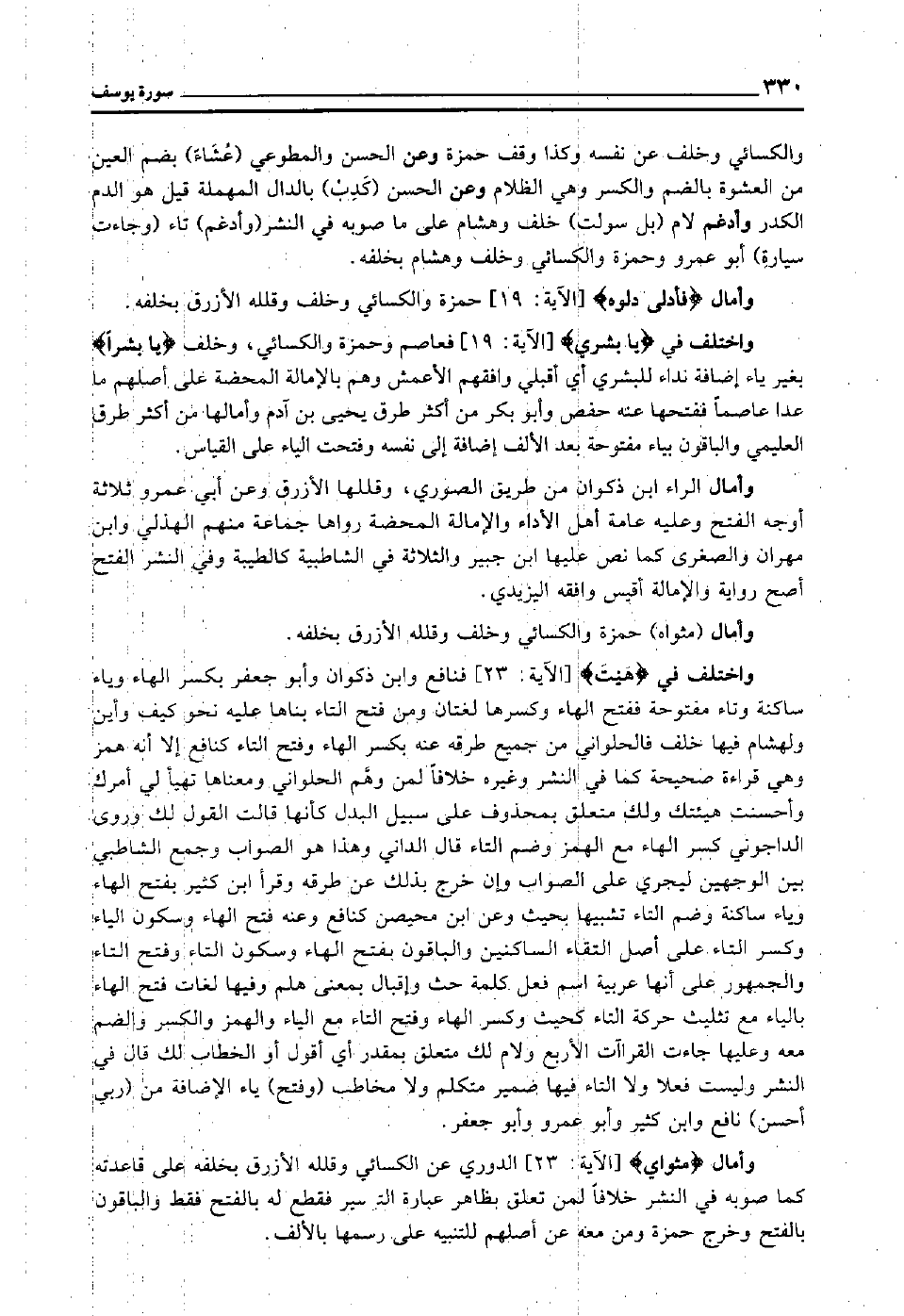 وأمال "مَثْوَاي" [الآية: 23] الدوري عن الكسائي, وقلله الأزرق بخلفه على قاعدته كما صوبه في النشر خلافا لمن تعلق بظاهر عبارة التيسير فقطع له بالفتح فقط, والباقون بالفتح وخرج حمزة ومن معه عن أصلهم للتنبيه على رسمها بالألف.