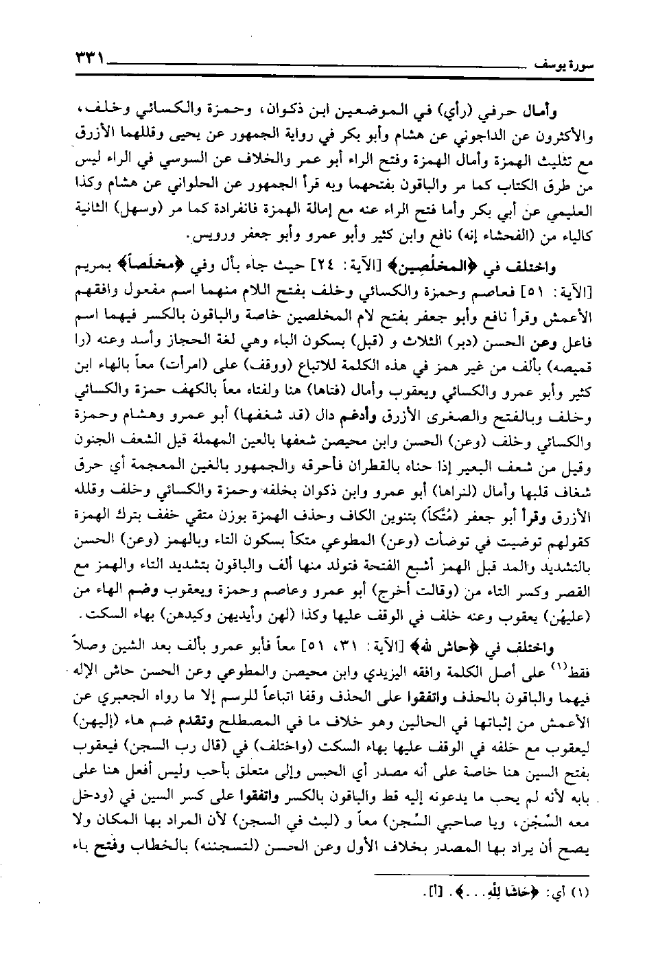 واختلف في "حَاشَ لِلَّه" [الآية: 31، 51] معا فأبو عمرو بألف بعد الشين وصلا فقط1 على أصل الكلمة وافقه اليزيدي وابن محيصن والمطوعي, وعن الحسن حاش الإله فيهما, والباقون بالحذف, واتفقوا على الحذف وقفا اتباعا للرسم, إلا ما رواه الجعبري عن الأعمش من إثباتها في الحالين وهو خلاف ما في المصطلح, وتقدم ضم هاء "إليهن" ليعقوب مع خلفه في الوقف عليها بهاء السكت "واختلف" في "قال رب السجن" فيعقوب بفتح السين هنا خاصة على أنه مصدر أي: الحبس وإلى متعلق بأحب وليس أفعل هنا على بابه؛ لأنه لم يحب ما يدعونه إليه قط, والباقون بالكسر واتفقوا على كسر السين في "ودخل معه السجن, ويا صاحبي السجن" معا و"لبث في السجن" لأن المراد بها المكان, ولا يصح أن يراد بها المصدر بخلاف الأول, وعن الحسن "لتسجننه" بالخطاب وفتح باء