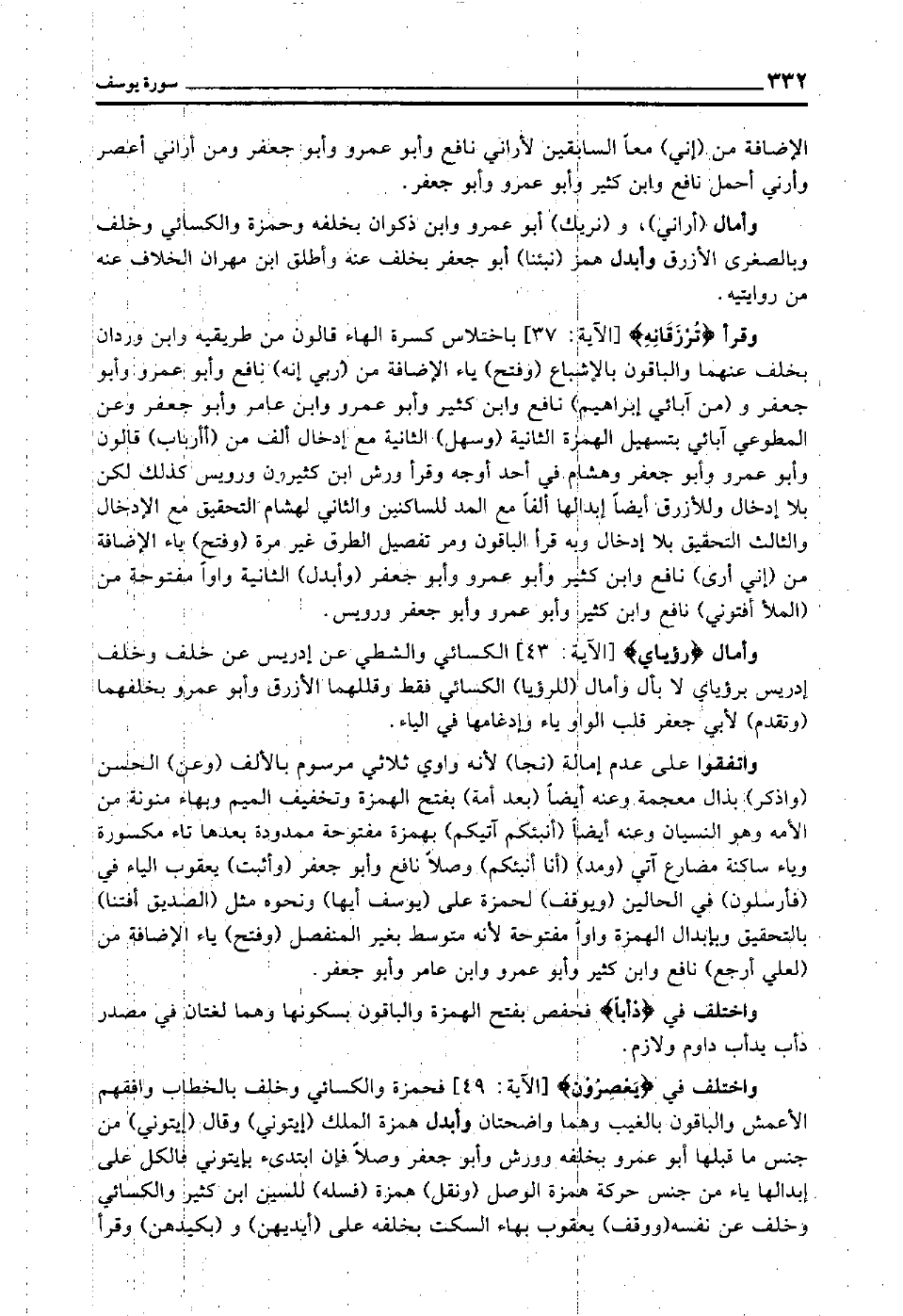 وقرأ "تُرْزَقَانِه" [الآية: 37] باختلاس كسرة الهاء قالون من طريقيه وابن وردان بخلف عنهما, والباقون بالإشباع "وفتح" ياء الإضافة من "ربي إنه" نافع وأبو عمرو وأبو جعفر و"من أبائي إبراهيم" نافع وابن كثير وأبو عمرو وابن عامر وأبو جعفر, وعن المطوعي آبائي بتسهيل الهمزة الثانية "وسهل" الثانية مع إدخال ألف من "أأرباب" قالون وأبو عمرو وأبو جعفر وهشام في أحد أوجه, وقرأ ورش وابن كثير ورويس كذلك, لكن بلا إدخال, وللأزرق أيضا إبدالها ألفا مع المد للساكنين, والثاني لهشام التحقيق مع الإدخال, والثالث التحقيق بلا إدخال, وبه قرأ الباقون, ومر تفصيل الطرق غير مرة "وفتح" ياء الإضافة من "إني أرى" نافع وابن كثير وأبو عمرو وأبو جعفر "وأبدل" الثانية واوا مفتوحة من "الملأ أفتوني" نافع وابن كثير وأبو عمرو وأبو جعفر ورويس.