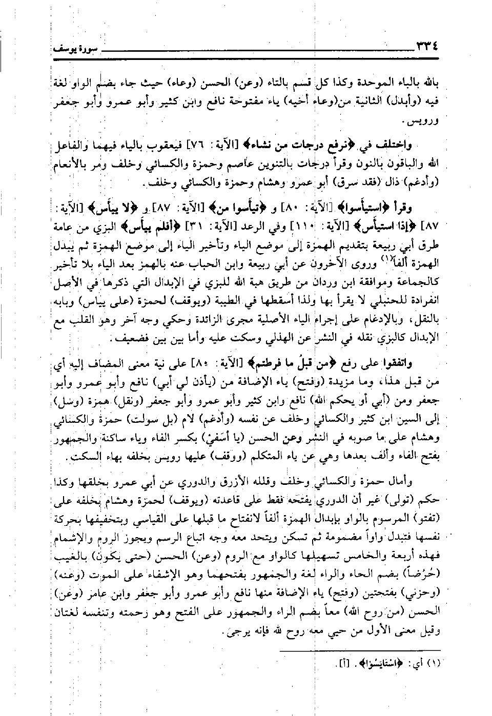 وقرأ "اسْتَيْأَسُوا" من [الآية: 87] و"لا يَيْأَس" [الآية: 87] "إِذَا اسْتَيْأَس" [الآية: 110] وفي [الرعد الآية: 31] "أَفَلَمْ يَيْأَس" البزي من عامة طرق أبي ربيعة بتقديم الهمزة إلى موضع الياء, وتأخير الياء إلى موضع الهمزة, ثم يبدل الهمزة ألفا1, وروى الآخرون عن أبي ربيعة وابن الحباب عنه بالهمز بعد الياء بلا تأخير كالجماعة, وموافقة ابن وردان من طريق هبة الله للبزي في الإبدال التي ذكرها في الأصل انفرادة للحنبلي لا يقرأ بها, ولذا أسقطها في الطيبة "ويوقف" لحمزة "على يياس" وبابه بالنقل وبالإدغام على إجراء الياء الأصلية مجرى الزائدة, وحكي وجه آخر وهو القلب مع الإبدال كالبزي نقله في النشر عن الهذلي, وسكت عليه, وأما بين بين فضعيف.