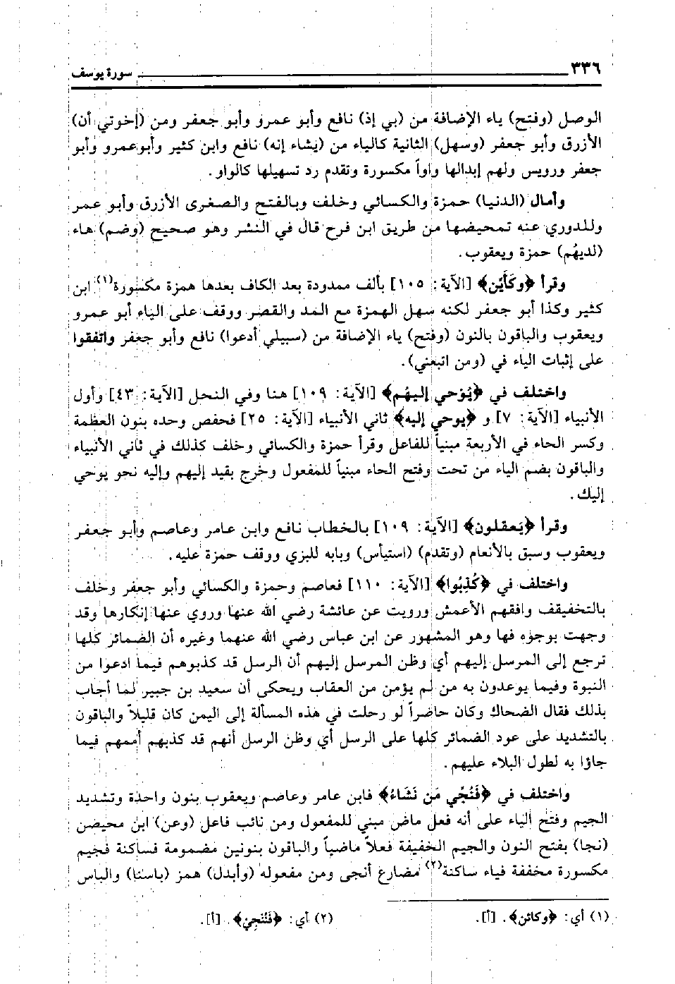 واختلف في "يوحي إليهم" [الآية: 109] هنا وفي [النحل الآية: 43] وأول [الأنبياء الآية: 7] و"يوحي إليه" ثاني [الأنبياء الآية: 25] فحفص وحده بنون العظمة وكسر الحاء في الأربعة مبنيا للفاعل, وقرأ حمزة والكسائي وخلف كذلك في ثاني الأنبياء, والباقون بضم الياء من تحت وفتح الحاء مبنيا للمفعول, وخرج بقيد إليهم وإليه نحو: يوحي إليك.
