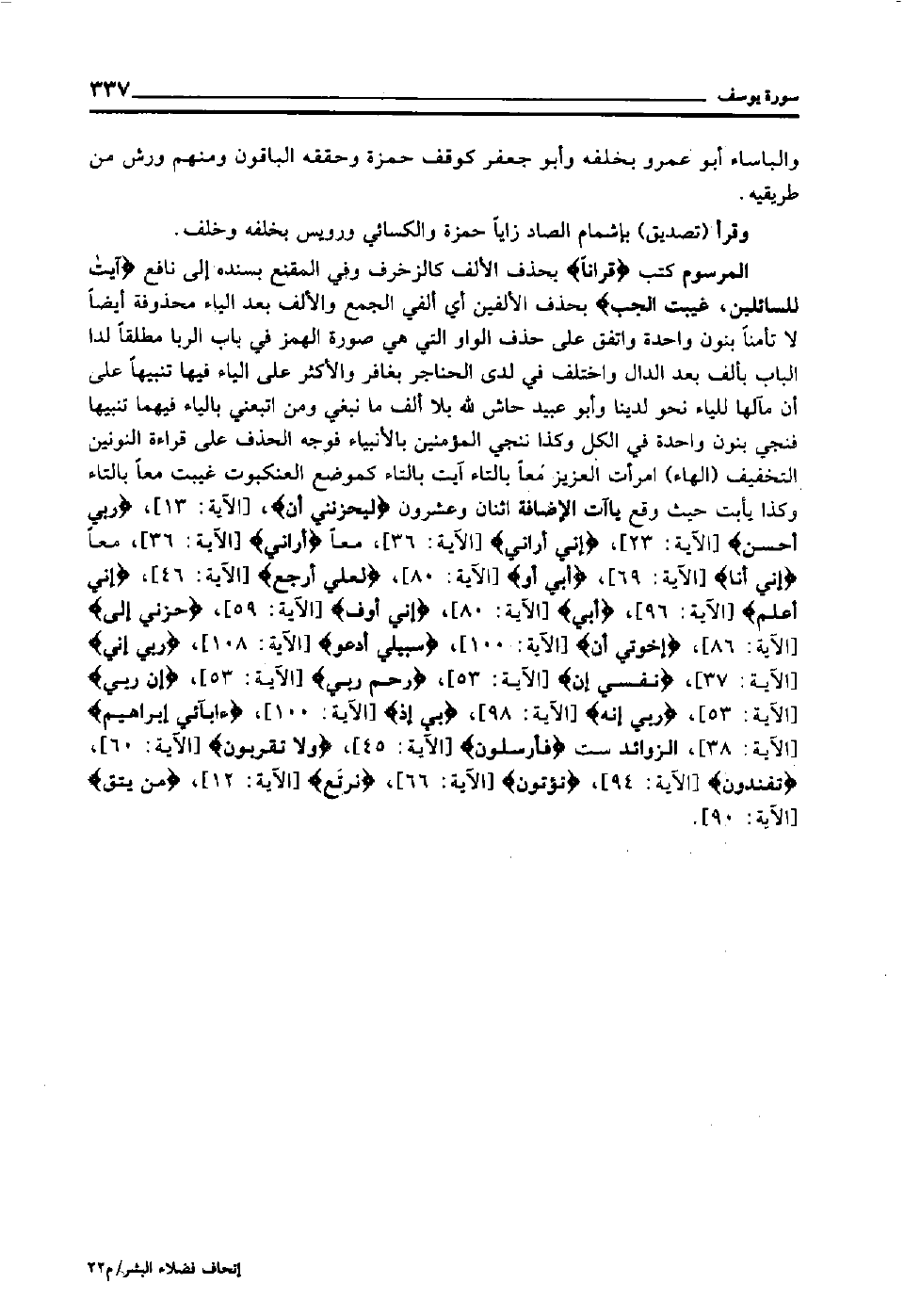 المرسوم كتب "قرانا" بحذف الألف كالزخرف, وفي المقنع بسنده إلى نافع "آيت للسائلين، غيبت الجب" بحذف الألفين أي: ألفي الجمع والألف بعد الياء محذوفة أيضا, لا تأمنا بنون واحدة, واتفق على حذف الواو التي هي صورة الهمز في باب الربا مطلقا لدا الباب بألف بعد الدال, واختلف في لدى الحناجر بغافر, والأكثر على الياء فيها تنبيها على أن مآلها للياء نحو: لدينا وأبو عبيد حاش لله بلا ألف, ما نبغي ومن اتبعني بالياء فيهما تنبيها, فنجي بنون واحدة في الكل, وكذا ننجي المؤمنين بالأنبياء, فوجه الحذف على قراءة النونين التخفيف "الهاء" امرأت العزيز معا بالتاء آيت بالتاء كموضع العنكبوت غيبت معا بالتاء, وكذا يأبت حيث وقع ياءات الإضافة اثنان وعشرون "لَيَحْزُنُنِي أَن" [الآية: 13] "رَبِّي أَحْسَن" [الآية: 23] "إِنِّي أَرَانِي" [الآية: 36] معا "أراني" [الآية: 36] معا "إِنِّي أَنَا" [الآية: 69] "أَبِي أَو" [الآية: 80] "لَعَلِّي أَرْجِع" [الآية: 46] "إِنِّي أَعْلَم" [الآية: 96] "أبي" [الآية: 80] "إنِّي أُوفِي" [الآية: 59] "حُزْنِي إِلَى" [الآية: 86] "إِخْوَتِي أن" [الآية: 100] "سَبِيلِي أَدْعُو" [الآية: 108] "رَبِّي إِنِّي" [الآية: 37] "نَفْسِي إِن" [الآية: 53] "رَحِمَ رَبِّي" [الآية: 53] "إِنَّ رَبِّي" [الآية: 53] "رَبِّي إِنَّه" [الآية: 98] "بِي إِذ" [الآية: 100] "ءابآئي إِبْرَاهِيم" [الآية: 38] الزوائد ست "فَأَرْسِلُون" [الآية: 45] "وَلا تَقْرَبُون" [الآية: 60] "تُفَنِّدُون" [الآية: 94] "تُؤْتُون" [الآية: 66] "نرتع" [الآية: 12] "مَنْ يَتَّق" [الآية: 90] .