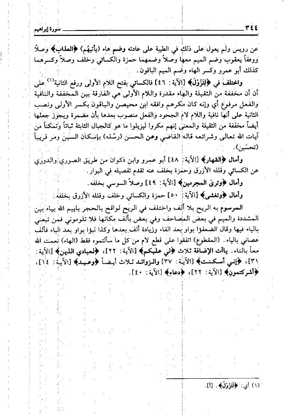 المرسوم به الريح بلا ألف واختلف في الريح لواقح بالحجر باييم الله بياء بين المشددة والميم في بعض المصاحف, وفي بعض بألف مكانها فلا تلوموني فمن تبعني بالياء فيها, وقال: الضعفؤا بواو بعد الفاء وزيادة ألف بعدها, وكذا نبؤا بواو بعد الباء فألف عصاني بالياء. "المقطوع" اتفقوا على قطع لام من كل ما سألتموه فقط "الهاء" نعمت الله معا بالتاء ياءات الإضافة ثلاث "لِّي عَلَيْكُم" [الآية: 22] "لِعِبَادِيَ الَّذِين" [الآية: 31] "إِنِّي أَسْكَنْت" [الآية: 37] والزوائد ثلاث أيضا "وعيد" [الآية: 14] "أشركتمون" [الآية: 22] "دُّعَاء" [الآية: 40] .