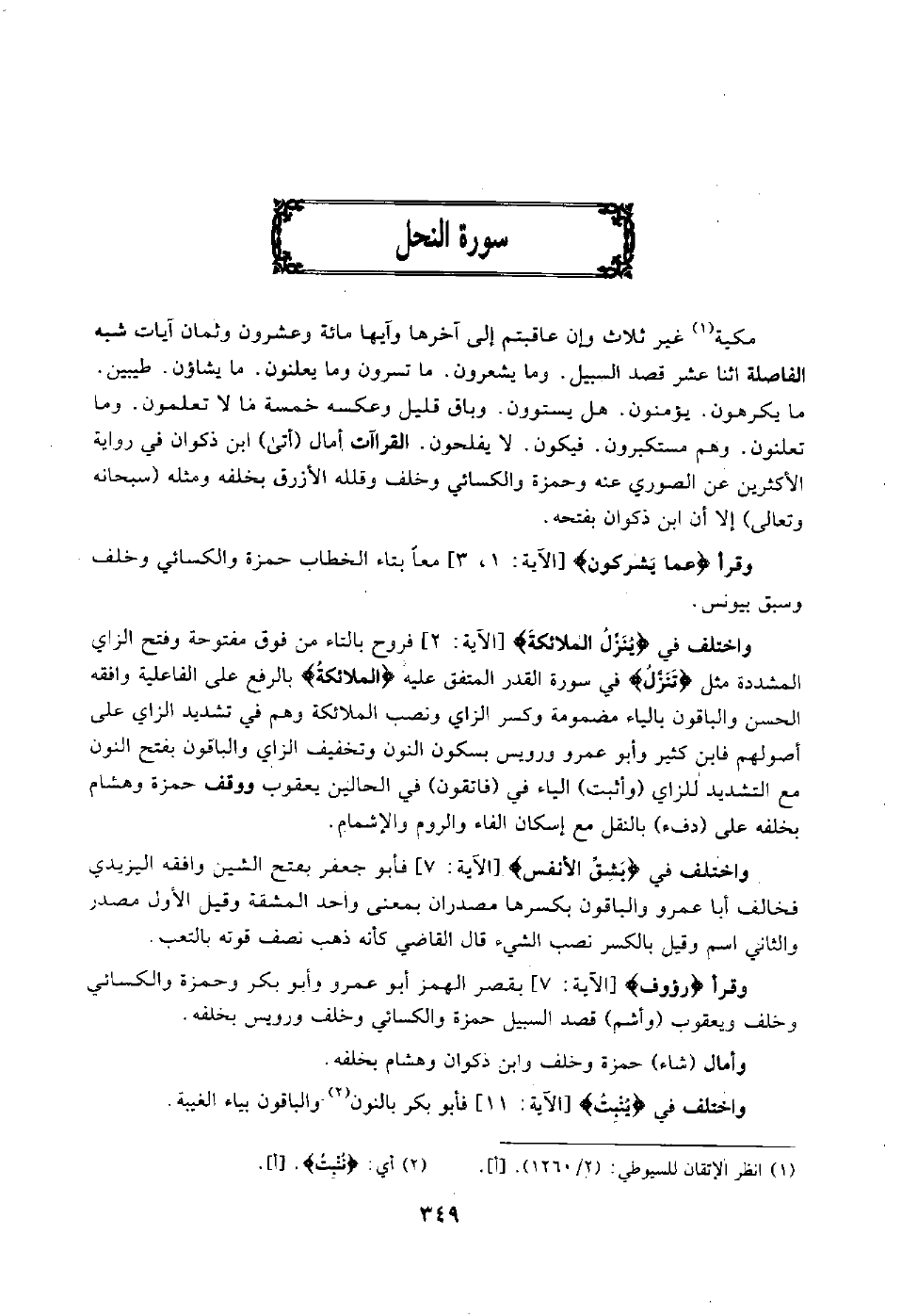 مكية1 غير ثلاث: وإن عاقبتم إلى آخرها, وآيها مائة وعشرون وثمان آيات, شبه الفاصلة اثنا عشر: قصد السبيل, وما يشعرون, ما تسرون, وما يعلنون, ما يشاؤن, طيبين, ما يكرهون, يؤمنون, هل يستوون, وباق قليل وعكسه خمسة: ما لا تعلمون, وما تعلنون, وهم مستكبرون, فيكون, لا يفلحون, القراءات أمال "أتى" ابن ذكوان في رواية الأكثرين عن الصوري عنه, وحمزة والكسائي وخلف, وقلله الأزرق بخلفه ومثله "سبحانه وتعالى" إلا أن ابن ذكوان بفتحه.