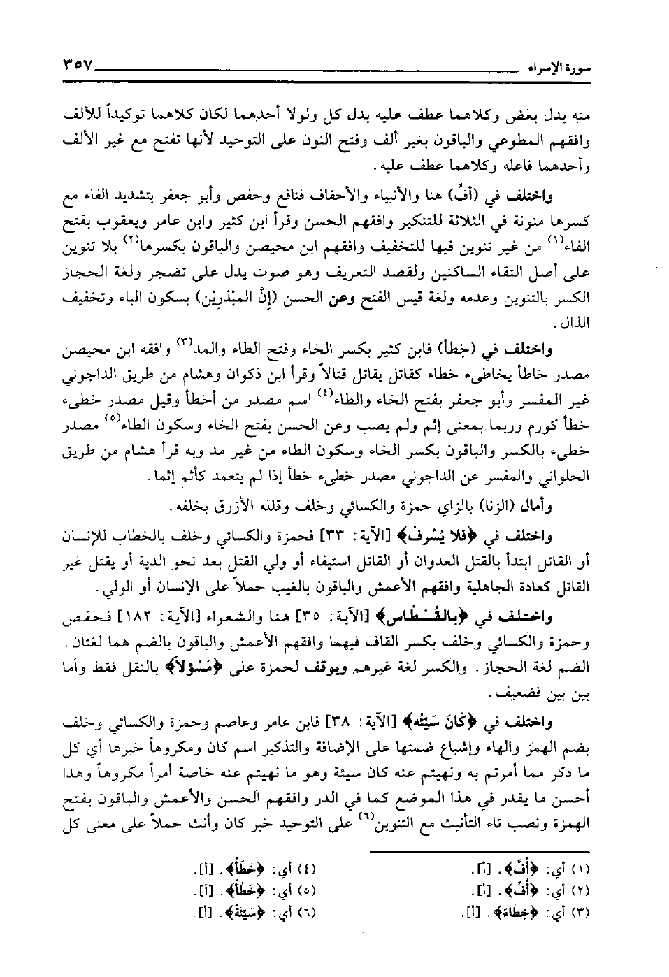 واختلف في "فَلا يُسْرِف" [الآية: 33] فحمزة والكسائي وخلف بالخطاب للإنسان أو القاتل ابتدأ بالقتل العدوان أو القاتل استيفاء أو ولي القتل بعد نحو الدية, أو يقتل غير القاتل كعادة الجاهلية, وافقهم الأعمش, والباقون بالغيب حملا على الإنسان أو الولي.