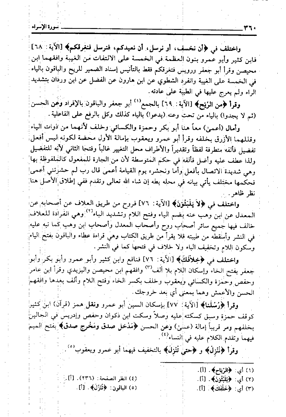 واختلف في "أن نخسف، أو نرسل، أن نعيدكم، فنرسل فنغرقكم" [الآية: 68] فابن كثير وأبو عمرو بنون العظمة في الخمسة على الالتفات من الغيبة, وافقهما ابن محيصن وقرأ أبو جعفر ورويس فتغرقكم فقط بالتأنيس إسناد الضمير للريح, والباقون بالياء في الخمسة على الغيبة, وانفرد الشطوي عن ابن هارون عن الفضل عن ابن وردان بتشديد الراء, ولم يعرج عليها في الطيبة على عادته.